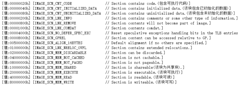 如果分析出来名为.text 的节的 characteristics 字段值为 0x60000020:因为 0x60000020 即第 31 位为 1、第 30 位为 1、第 6 位为 1,根据上面的分析:表示此.text 节的属性是可读、可执行、包含可执行代码,上面表中的那些值其实就是告诉你哪个位置上应该是 1