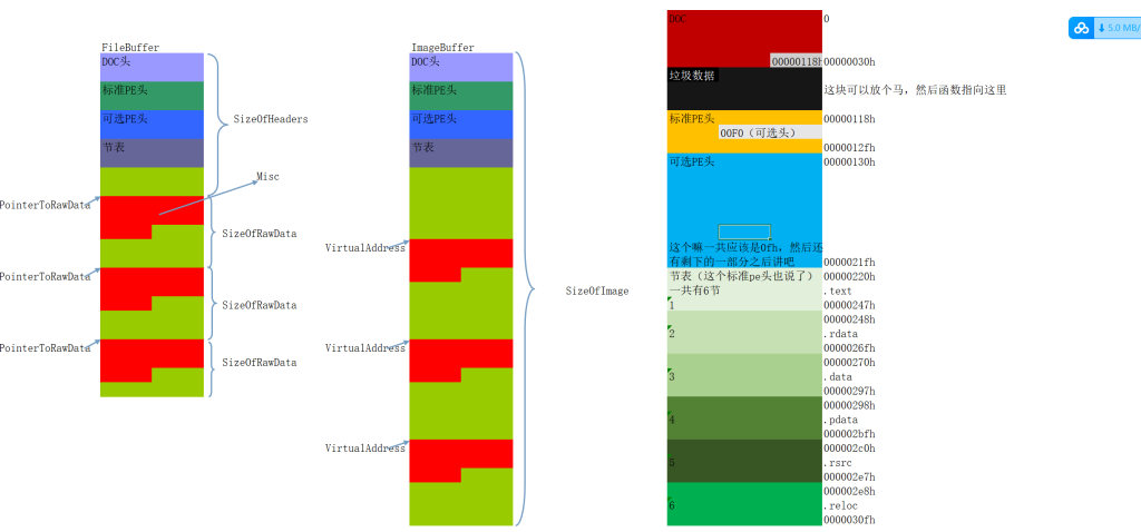 上面的两个 FileBuffer 和 ImageBuffer 提到的所有地址,其实都是虚拟地址,我们学过操作系统知道,操作系统最后还要将这些虚拟地址转换为物理地址,才是真正的装入到真实内存中。这个过程操作系统帮我们做了不需要手动做,所以现在先了解到上面两个过程即可,就是文件在硬盘上时的数据格式,复制一份到 FileBuffer 中显示出来;运行时文件经过 PE Loader 将文件拉伸,装载到 ImageBuffer 中