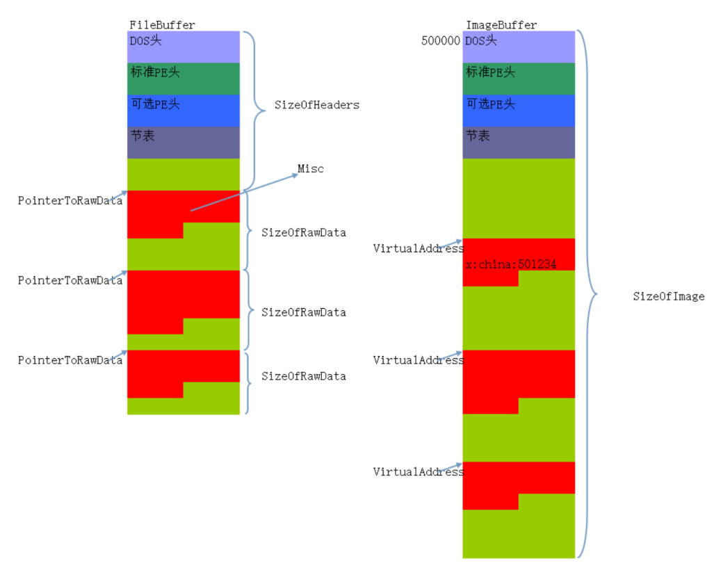我们写C语言的时候知道如果你定义一个数组已经初始化,比如int arr[1000] = {0};,此时编译成.exe文件存放在硬盘上时,这1000个int类型的0肯定会存放在某一个节中,并且分配1000个0的空间,这个空间大小是多少,最后重载到ImageBuffer时还是多少,即Misc.VirtualSize不管文件在硬盘上还是内存中的值都是一致的。所以,SizeOfRawData一般都是大于等于Misc.VirtualSize的