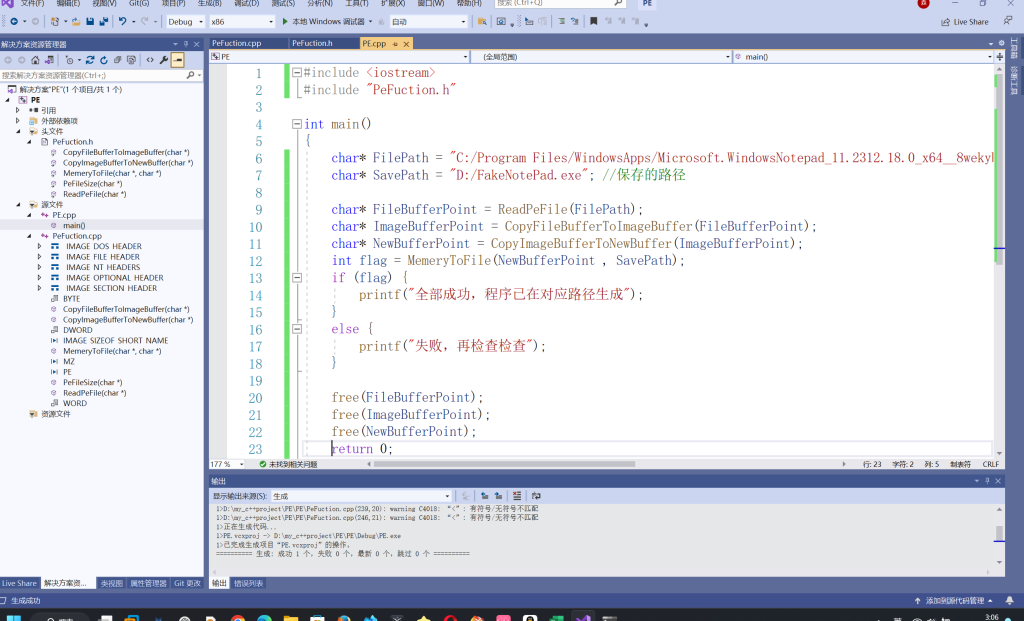 一开始我是写成上面这种,发现根本不行一直报错,这个好像只能都是 D 盘的东西才行(因为我的 vs 放在了 D 盘),其他盘的看反汇编确实一开始读文件路径下的程序都读不出来,所以改成了下面这个,然后就正常了,嗯嗯那个要强转一下,vs 编译器必须要强转,要不编译过不了