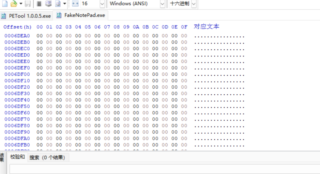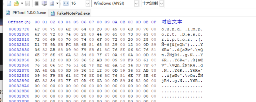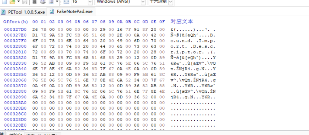 这两个都是能打开正常运行的,但确实为啥变大了,但用二进制编辑器打开,前面那些伸缩的情况应该都正常,问题就是这个 FakeNotePad.exe 就是在结束的时候多了好多 0x00,暂时还不懂原因