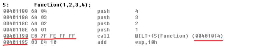 因为 E8 的当前地址为 0x00401190,真正要跳转的 Function 函数的地址为 0x00401014,根据公式:X = 要跳转的地址 - (E8 的地址 + 该指令长度) = 0x00401014 - (0x00401190 + 5)= 0xFFFFFE7F,由于内存是低地址向高地址存储,所以为 7F FE FF FF,所以最后 call 指令的硬编码为 E8 7F FE FF FF
