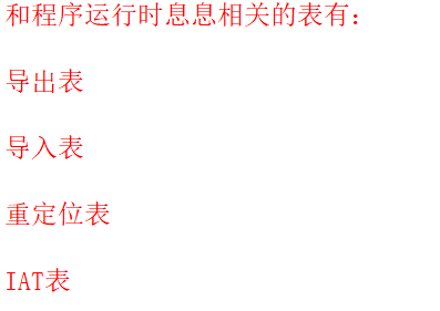 分别是:导出表、导入表、资源表、异常信息表、安全证书表、重定位表、调试信息表、版权所以表、全局指针表 TLS 表、加载配置表、绑定导入表、IAT 表、延迟导入表、COM 信息表 最后一个保留未使用