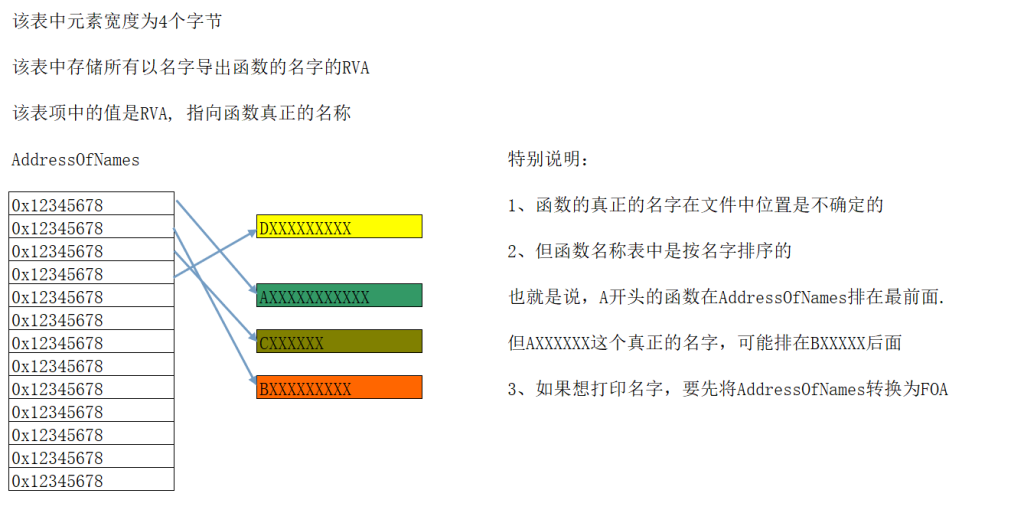 导出函数名称表 RVA(拉伸后的内存地址偏移,所以要先转成 FOA),即这个地址指向一个表,这个表中记录的是导出函数的名称字符串地址!!不是直接存储名称(且此字符串地址也是 RVA),这个就和之前有一次的指针数组的练习一样