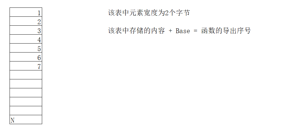 导出函数起始序号(最小的序号),比如有序号为 14、6、10、8 的导出函数,那么 Base 的值为 6