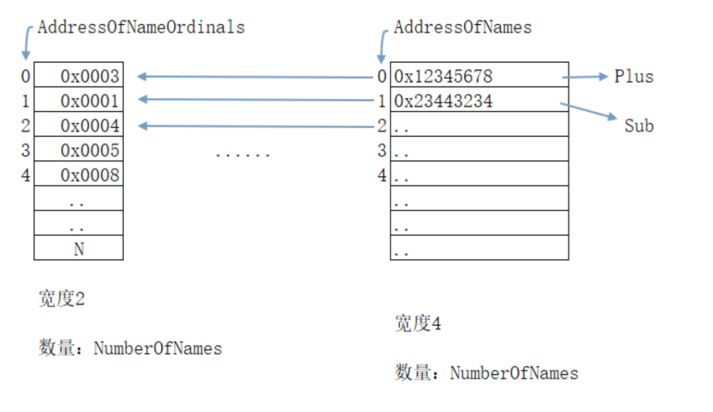 表中元素个数:由 NumberOfNames 决定,且和 AddressOfName 表一一对应的