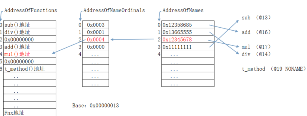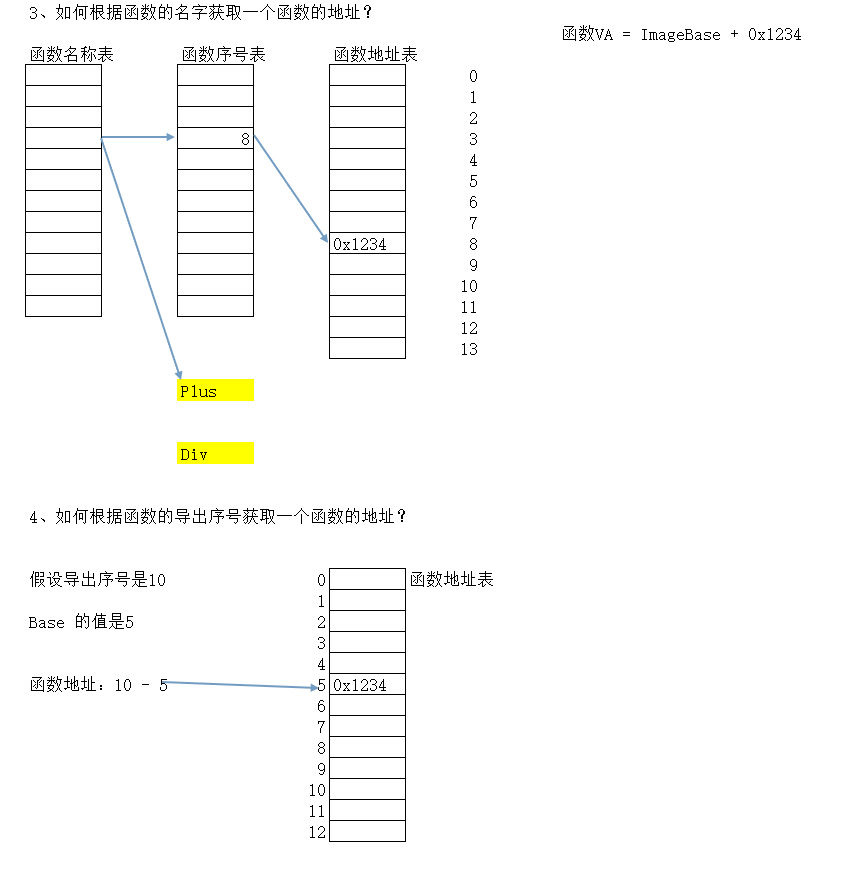 ,那么函数名称表中就不会有指向 Div 函数名的元素,同样函数序号表中也不会有 Div 的相对序号,但是在函数地址表中会留出来一个元素位置存储 Div 函数地址