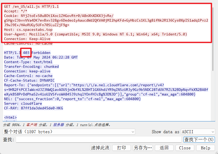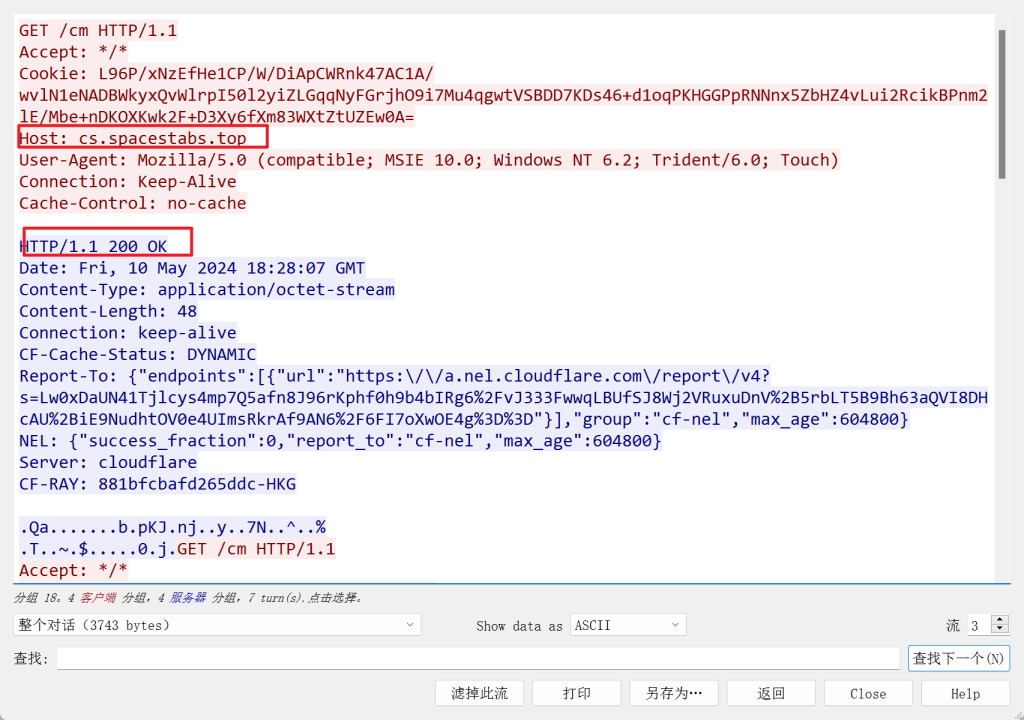 1.首先的话,用上面的这两条命令先去看一下这个木马到底是连接到了哪个 IP 的哪个端口,然后再分析一下这个木马走的是什么协议,如果攻击者用的是上面说到的 Cloudflare 的话,支持的协议就是 HTTP 和 HTTPS,而且支持的端口也就是上面说到的那几个,可以根据这一点再结合微步或者是 QAX 的威胁情报平台做个初步的判断,判断是不是用了 CDN 去给 C2 做了一个隐藏,如果真的是的话看流量,看看能不能把这个域名给查出来(也就是上面用到的 cs.spacestabs.top),一般的话没去做域前置肯定是可以在 HOST 头里面看到的,用了的话再下面那个针对于域前置的溯源手法再进一步讨论