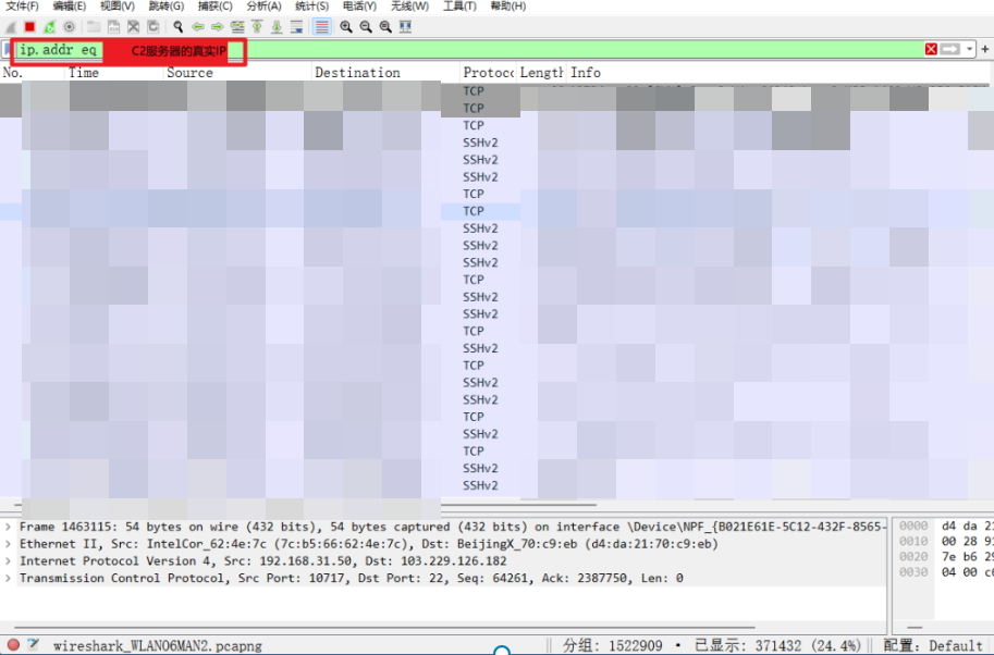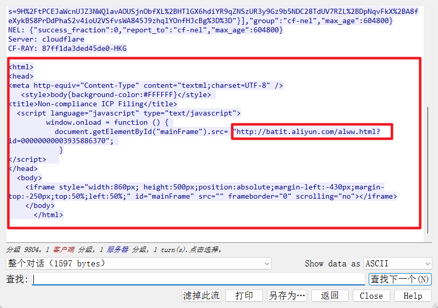 虽然这里寥寥几笔就带过了,但是这个东西确实还是很麻烦的,主要的原因在于自己把 C2 的放在了阿里云的服务器上面,以为没有备案的一个域名也可以正常的解析到阿里云这种国内的虚拟主机上面,结果 wireshark 看流量就是显示阿里云的防护对这个没有备案的域名进行了一个拦截。