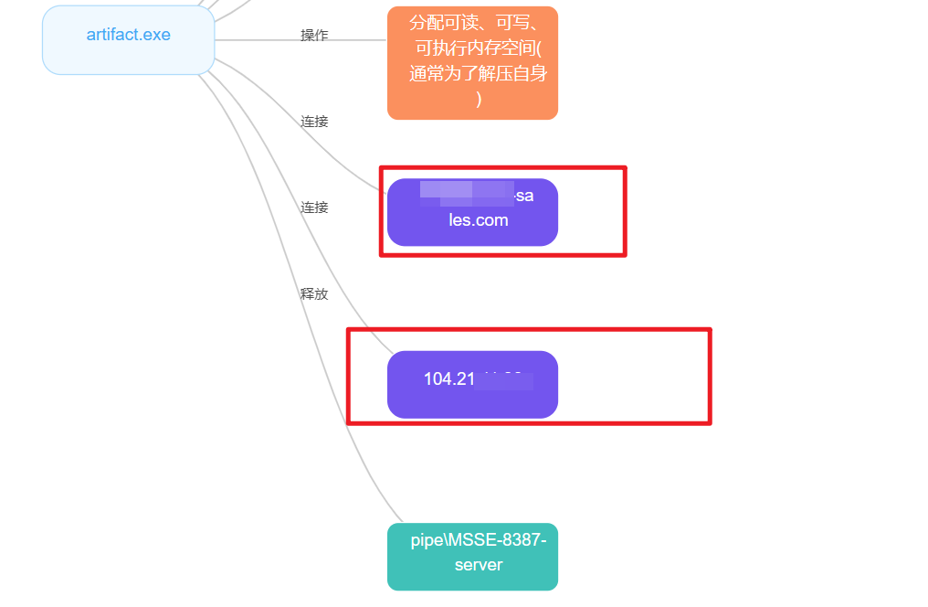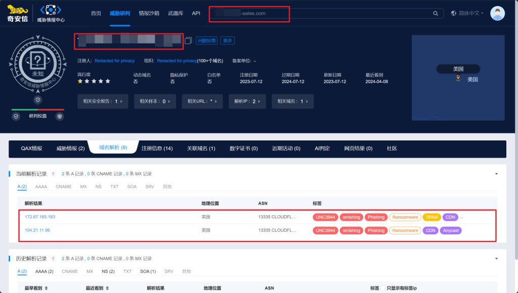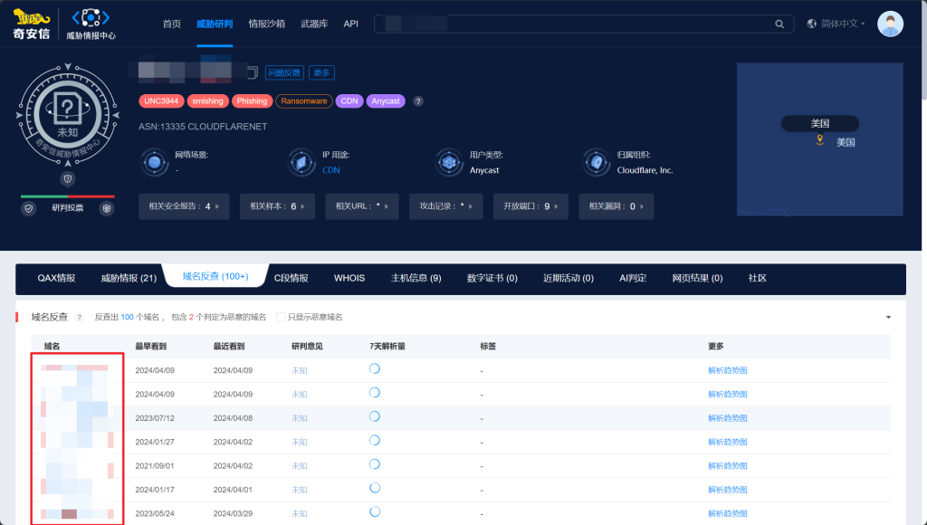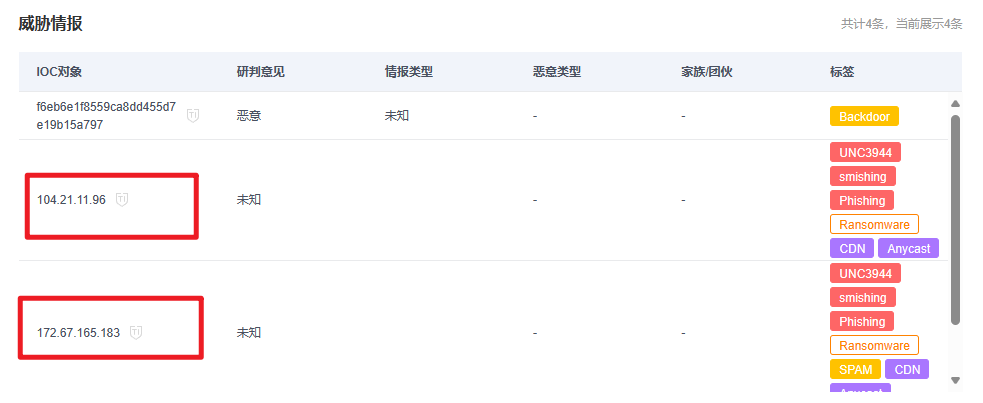 - 再用 QAX 的威胁情报沙箱跑一遍,看看外连的 IP 是 104.21.11.96 和 172.67.165.183
