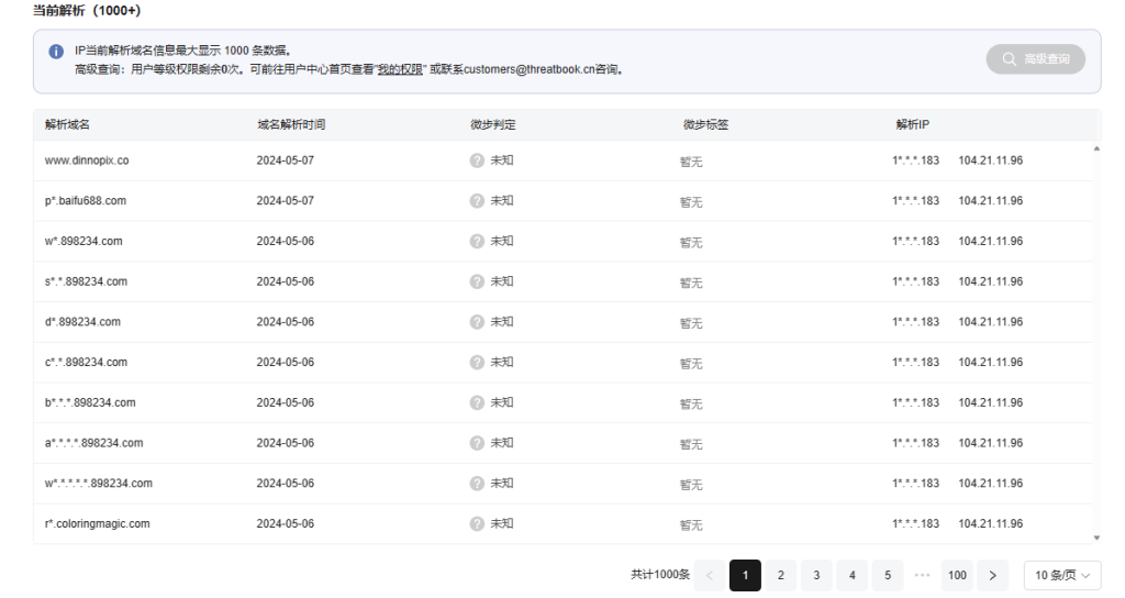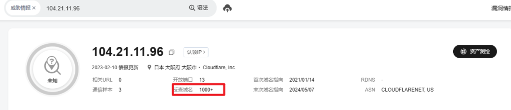 发现得到的 IP 是 104.21.11.96,把这个 IP 放到微步上查一下相关情报,看看是个啥