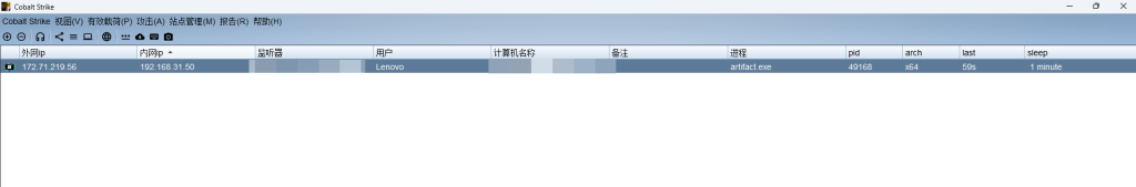 5.将生成的 EXE 文件运行起来,可以发现 CS 成功的上线