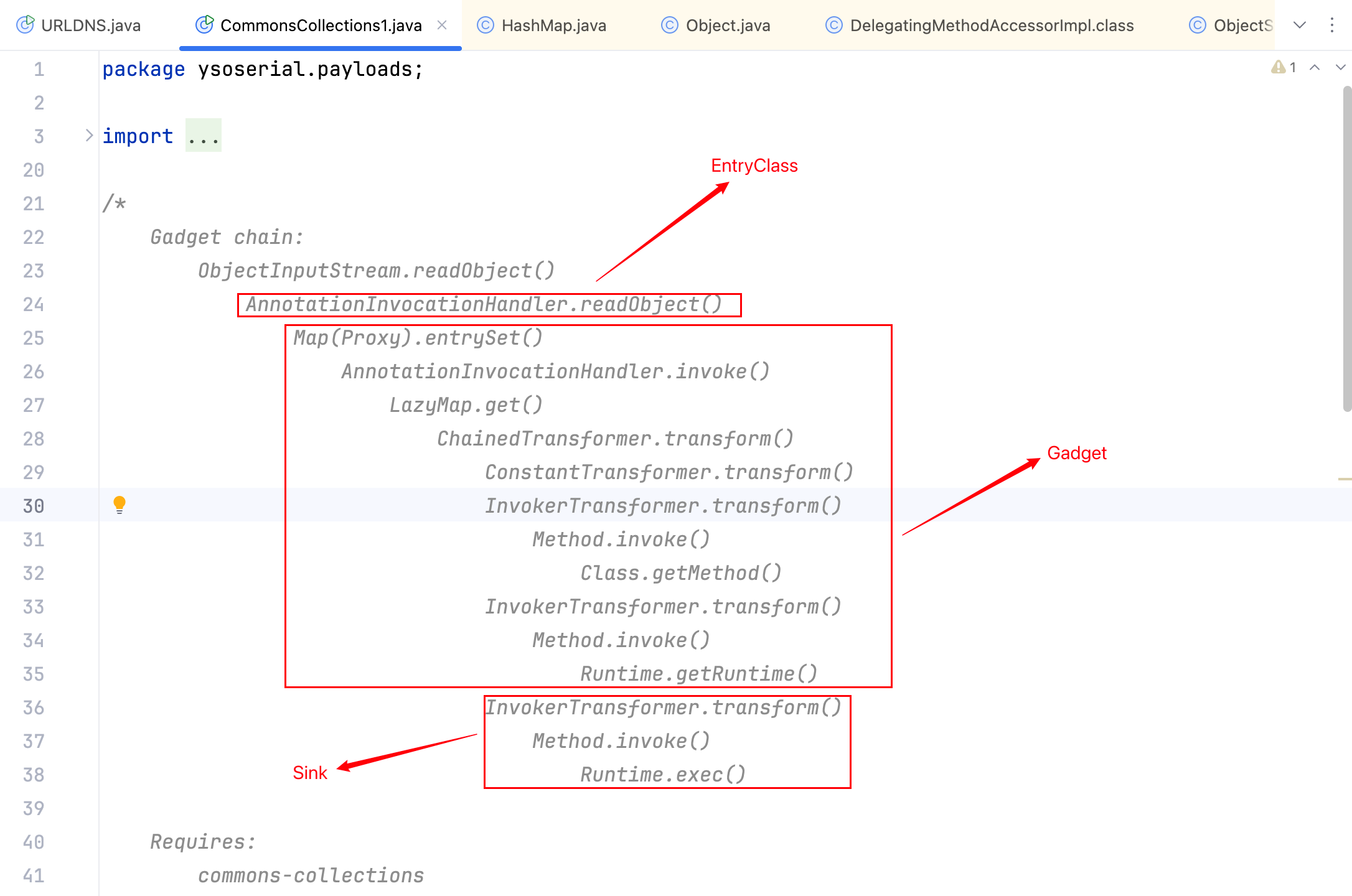 翻阅 ysoserial 中 CommonsCollections1 的源码,看它的 EntryClass、Gadget、Sink 如下–>