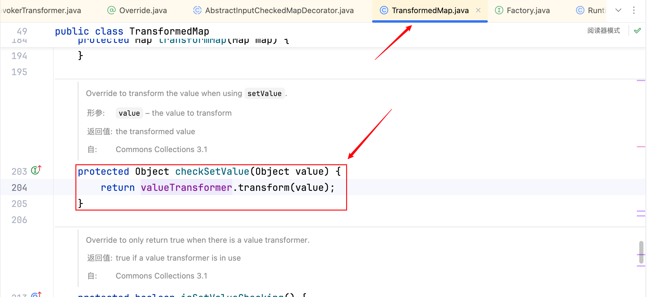 之前用 TransformedMap 主要就是用它的这个地方,也就是 checkSetValue 中的 transform 函数–>