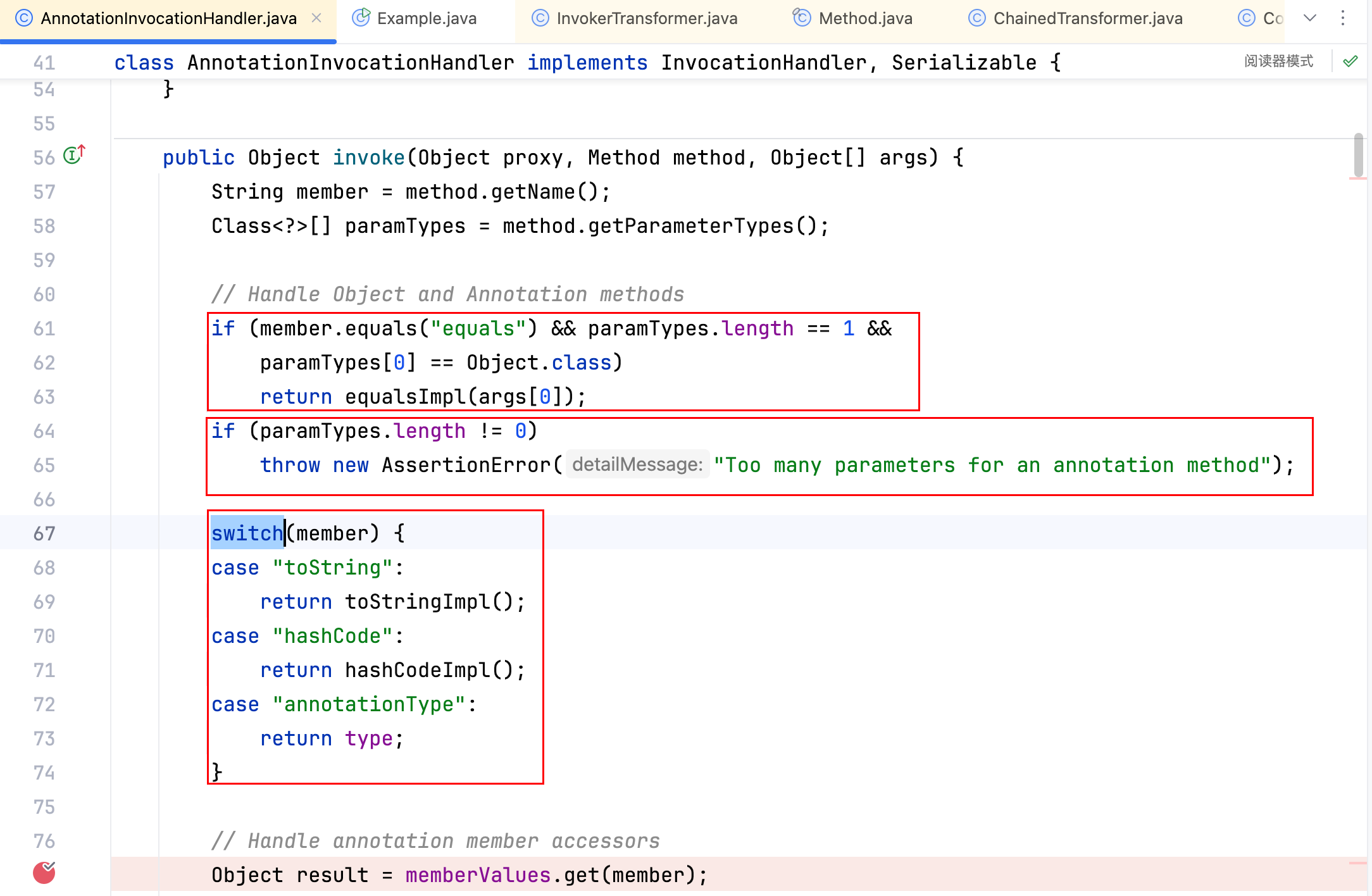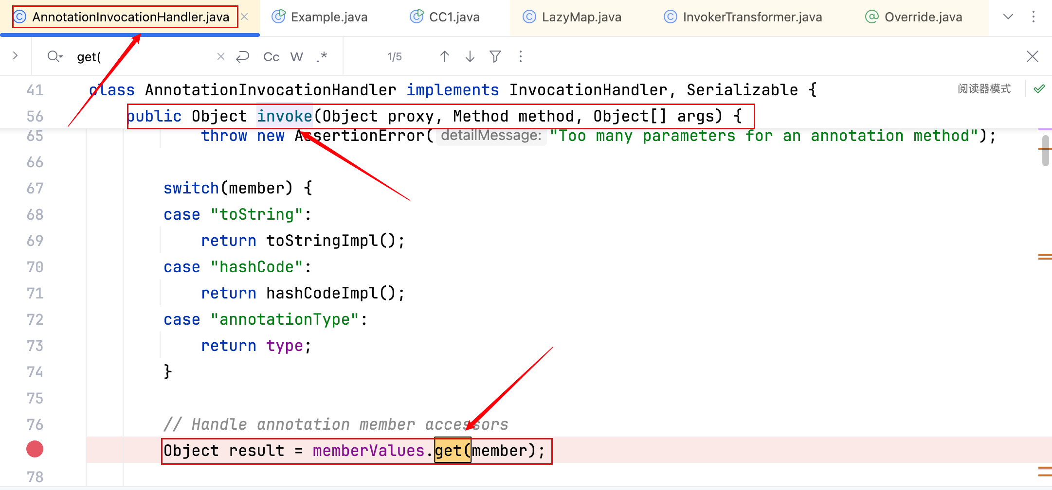 之后就是要找找看哪个类的 readObject 函数中调用了 get 方法,且是一个合格的入口类(合格就是参数接受 Object、最好存在 parm.get),可能作者是没找到合适的,最后找到了一个调用处理器类,里面 invoke 方法中有 xxx.get(parm),xxx 也是可以控制的,且这个调用处理器类就是之前提到的 AnnotationInvocationHandler,具体代码如下–>