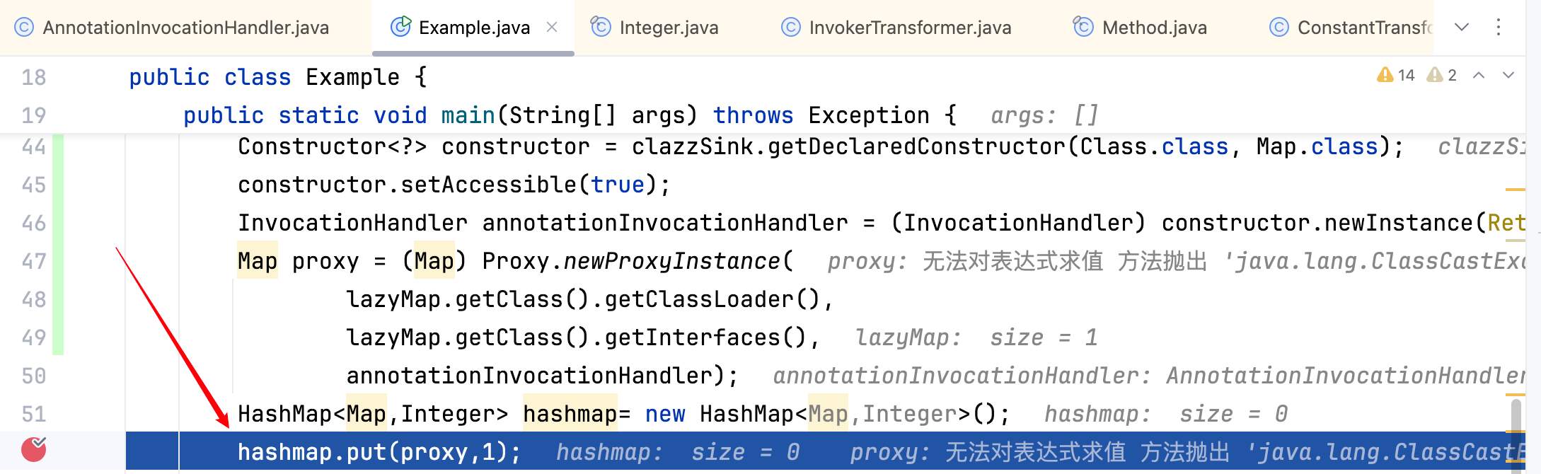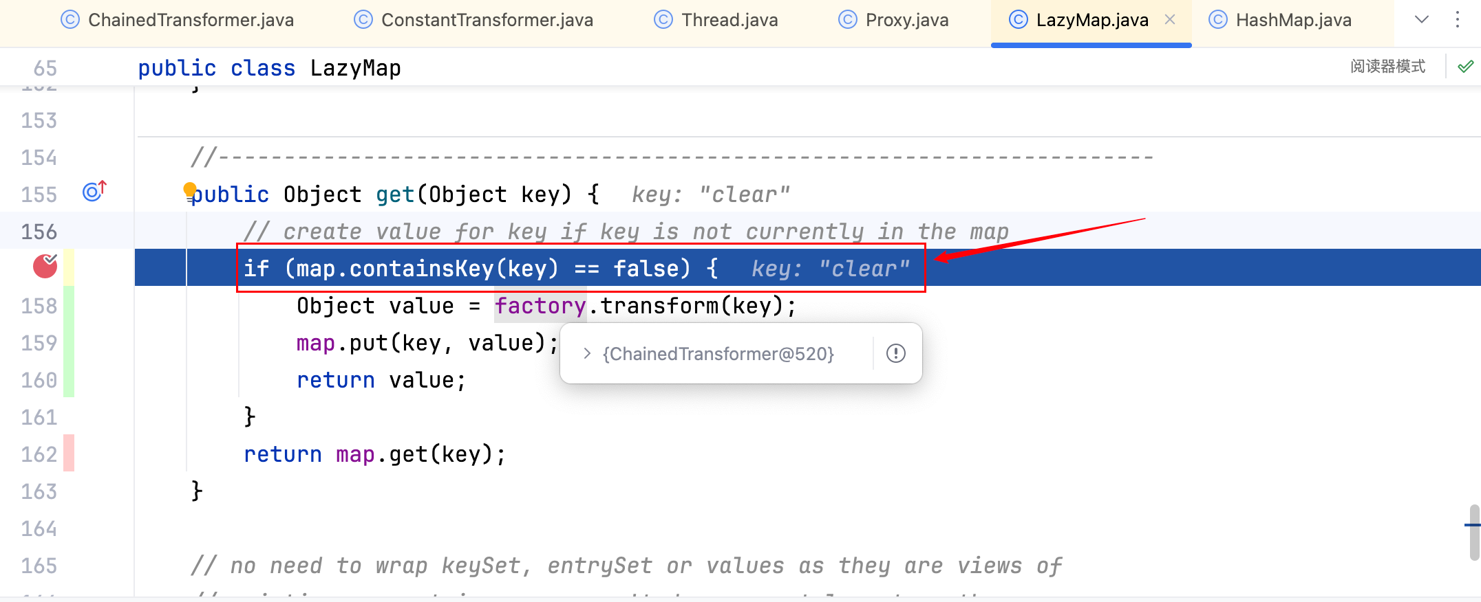 接着就会自动调用 annotationInvocationHandler 的 invoke 方法,在 invoke 方法中就会调用 lazyMap 的 get 方法,而 lazyMap 的 get 方法中就会调用 chainedTransformer 的 transform 方法,当然这里是有一个前提的:map 中不能包含 key 这个键,具体如下–>