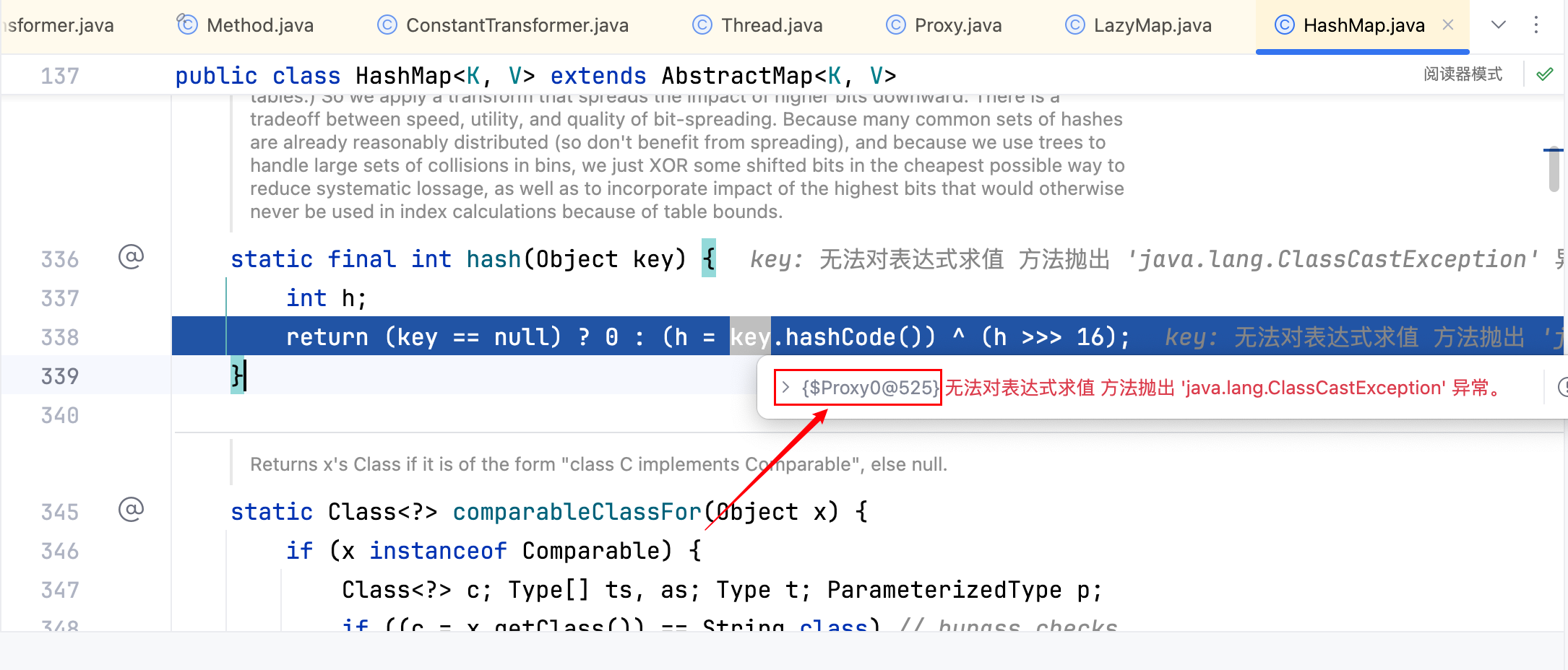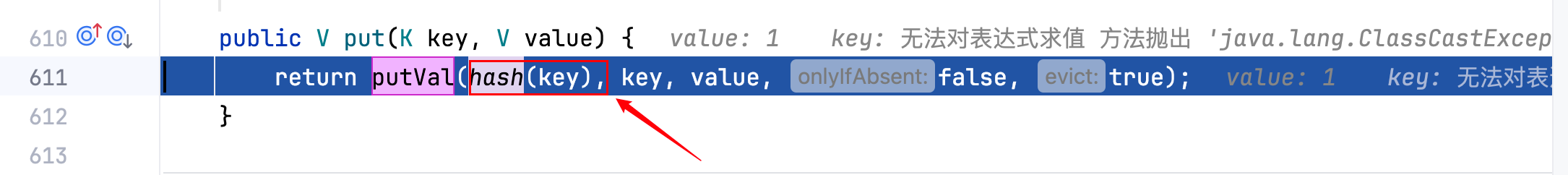 成功跟到,且执行key.hashCode()