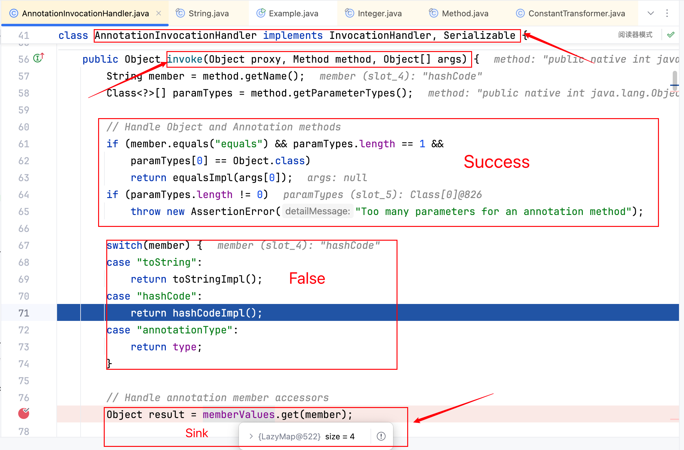 创建了一个动态代理 proxy,它的调用处理器是 annotationInvocationHandler,在初始化的时候就给 annotationInvocationHandler 传了一个 Retention.class(这里的 Retention.class 不是必须的,任意一个注解类型的 class 即可)和 lazyMap,然后调用 proxy 的特定方法(不是任意的,得过掉一些 if、switch 判断,不能是 equals、toString、hashCode、annotationType,且是一个无参方法),如下图–>