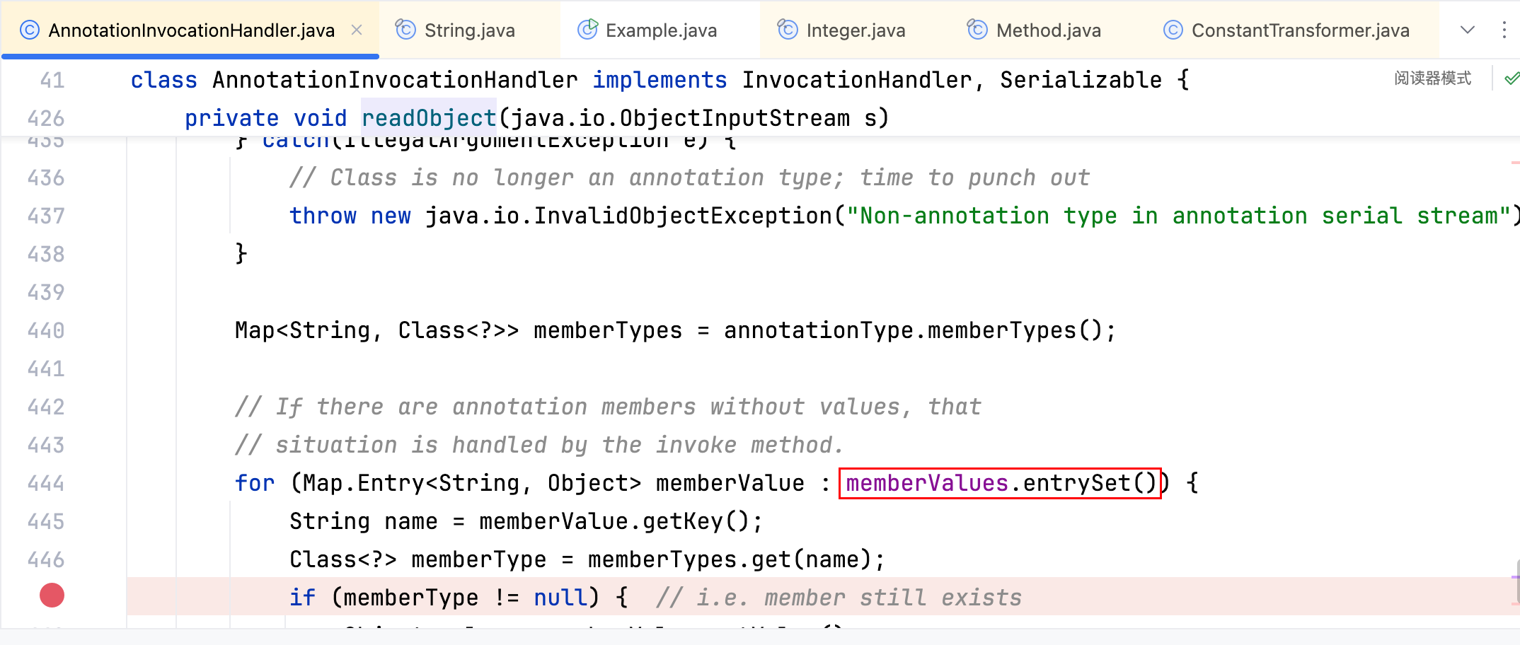 这里肯定能找到其他类,但 ysoserial 的作者也是炫技吧,还是把 AnnotationInvocationHandler 当作 EntryClass,因为在它的 readObject 函数中调用了memberValues.entrySet()