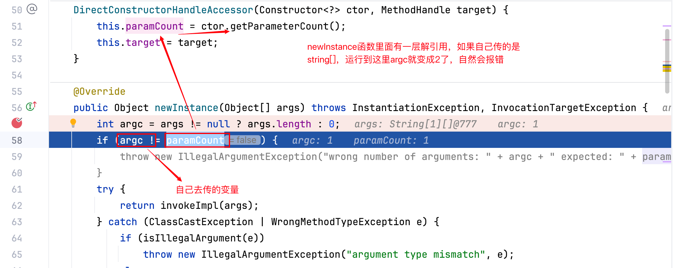 是二维数组的原因:去跟一下 newInstance 这个方法,它的参数也是一个变长参数,针对于数组这种类型,里面有一个默认解包的过程。
