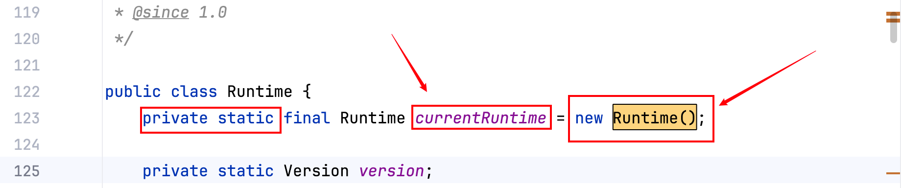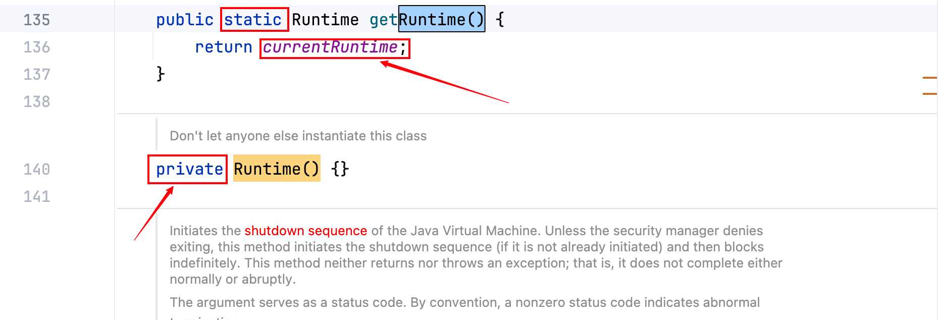 这个类的构造方法是私有的,所以不能通过 newInstance 去实例化它,下面贴图 Runtime 类实现单例模式的关键的三块代码
