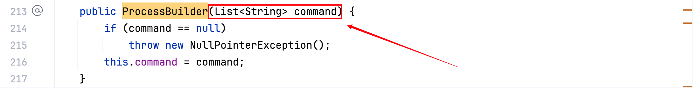 第一个构造器的参数是一个列表,第二个构造器的参数是一个可变长参数(也就是字符串数组),针对第一个构造器来写一个命令执行的方法,代码如下–>