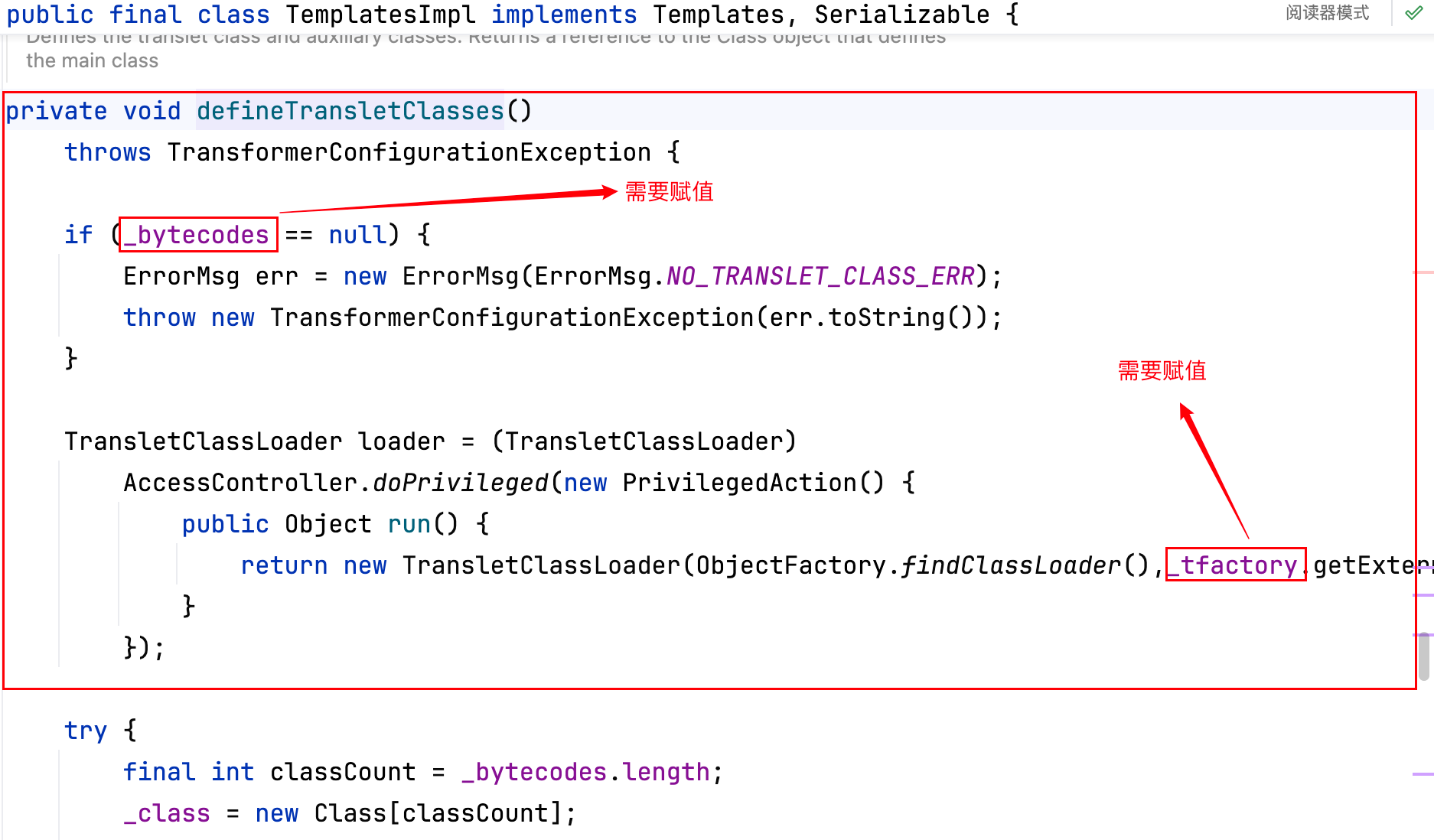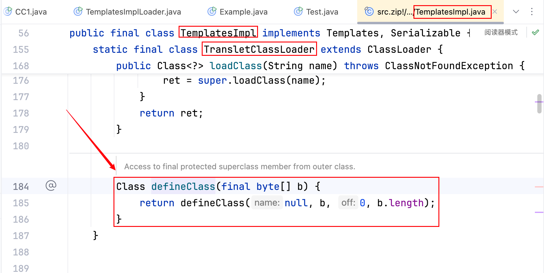 而这个 defineTransletClasses 方法的作用域是 private 的,如下–>