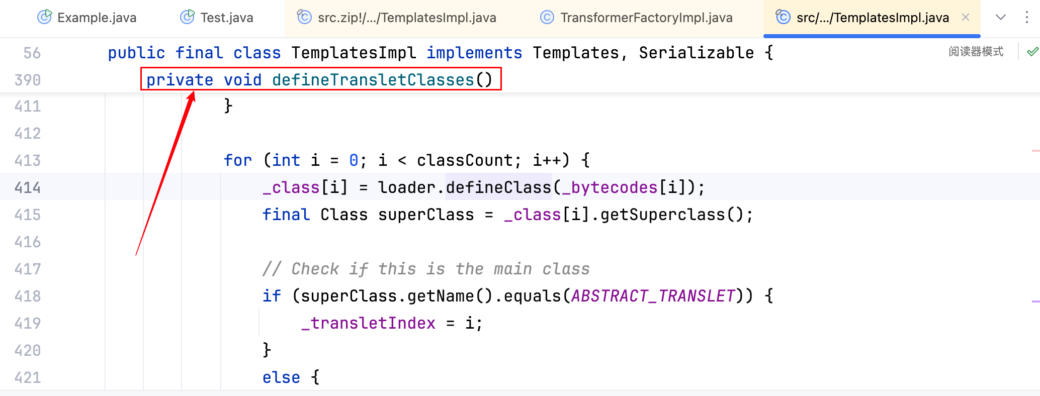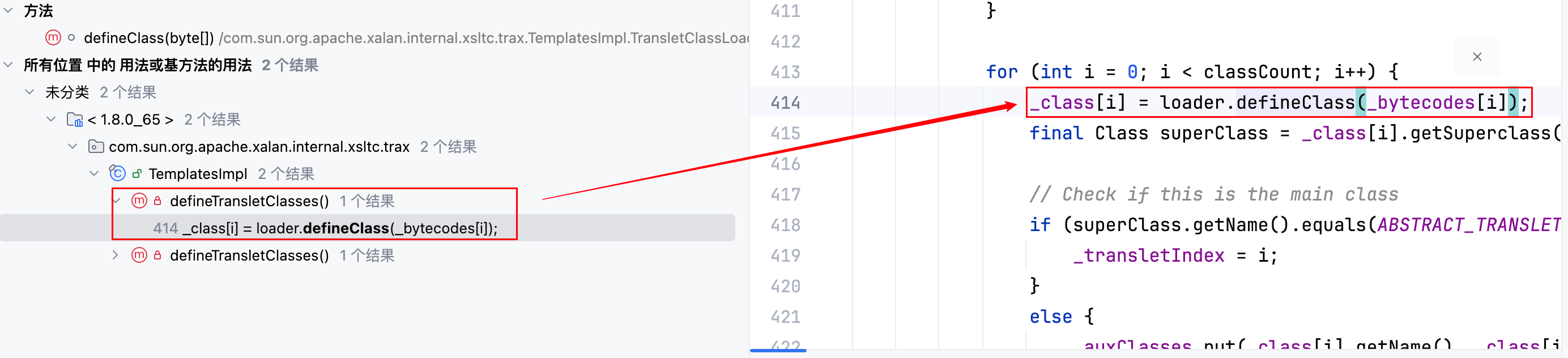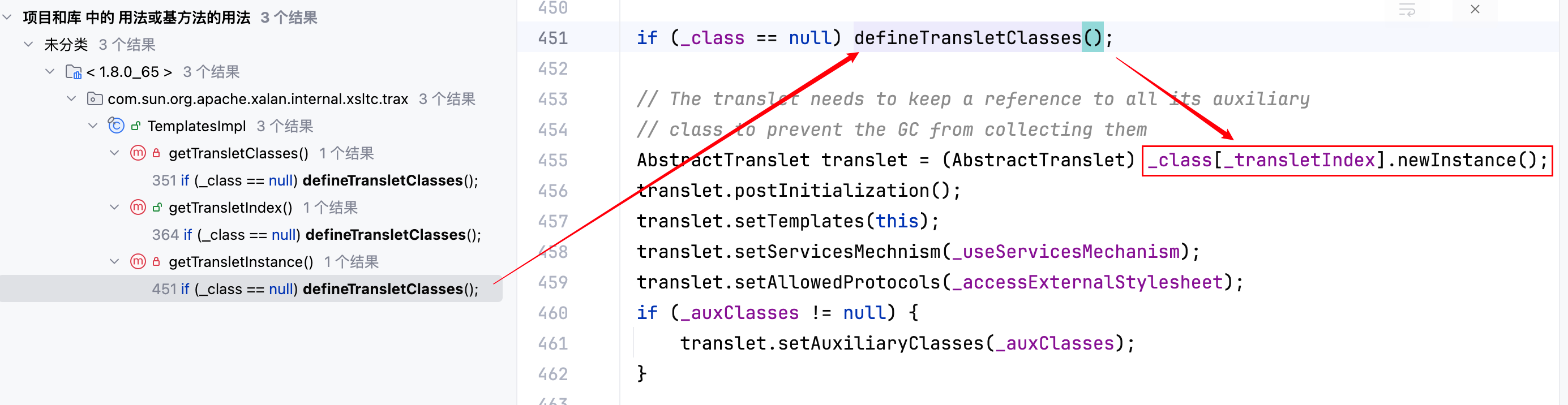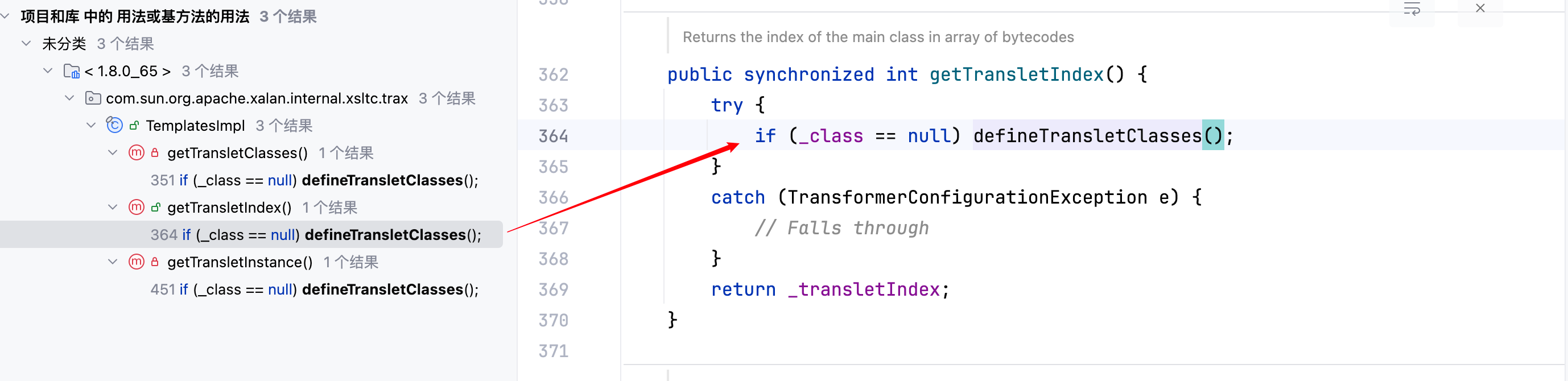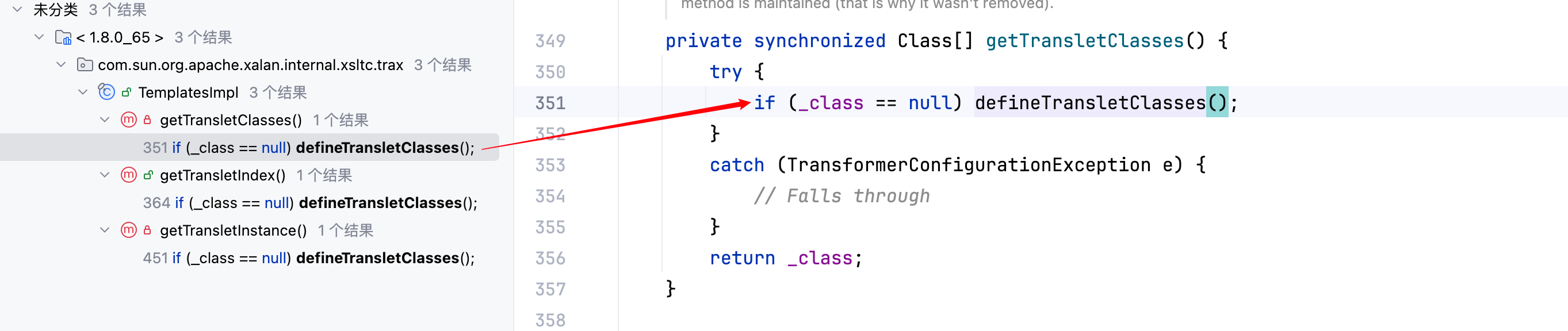再去寻找哪里去调用了 defineTransletClasses 方法,一共有三处,分别如下–>