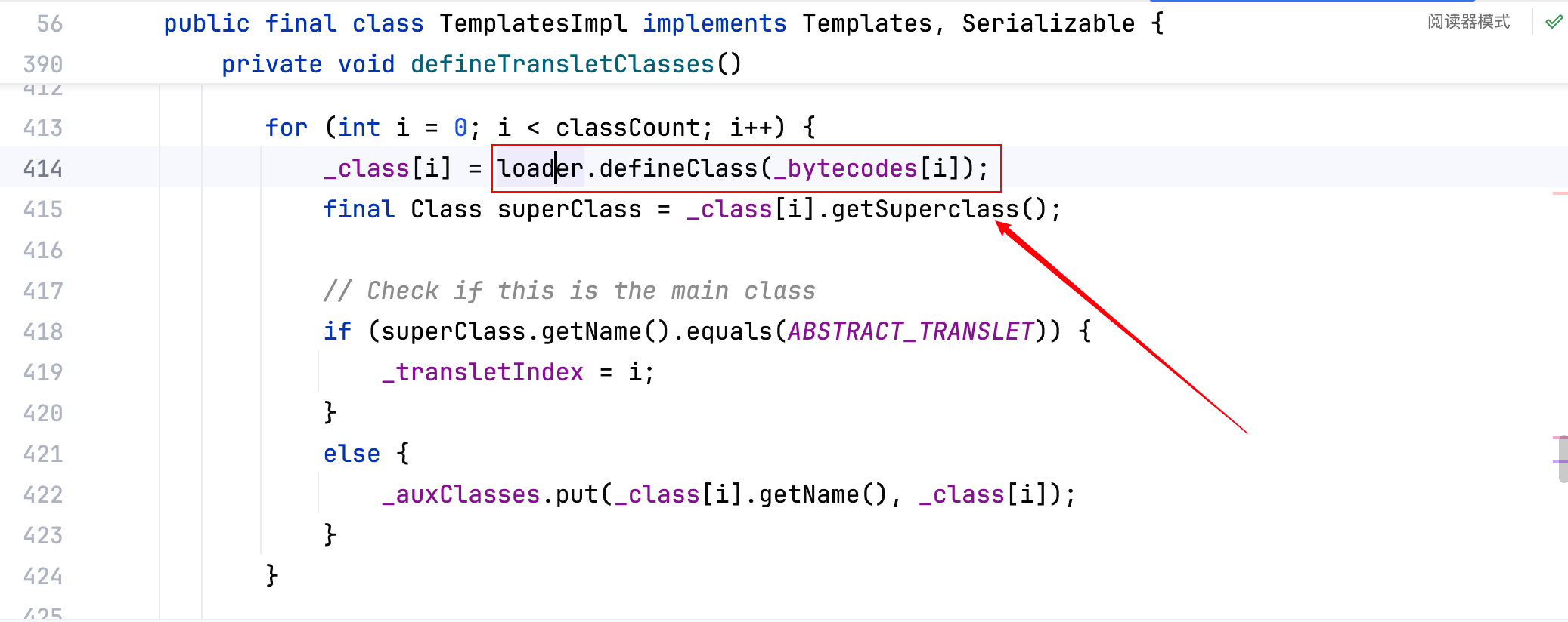 接着在com.sun.org.apache.xalan.internal.xsltc.trax.TemplatesImpl.defineTransletClasses(TemplatesImpl.java:422)