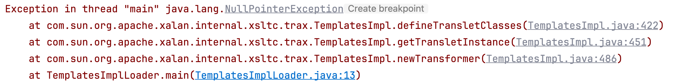 此时去执行 TemplatesImplLoader.main 方法,DNSlog 平台没有收到请求且有如下的报错。