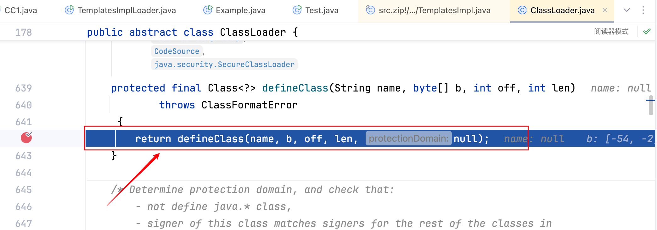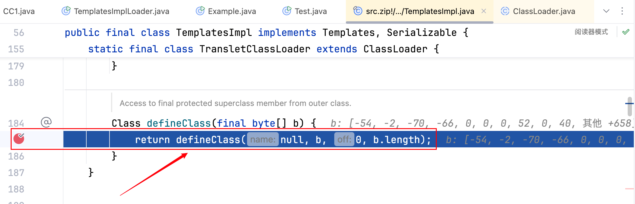 首先在 defineClass 方法中处下断点,可以发现已经成功的加载到了恶意字节码,如下–>
