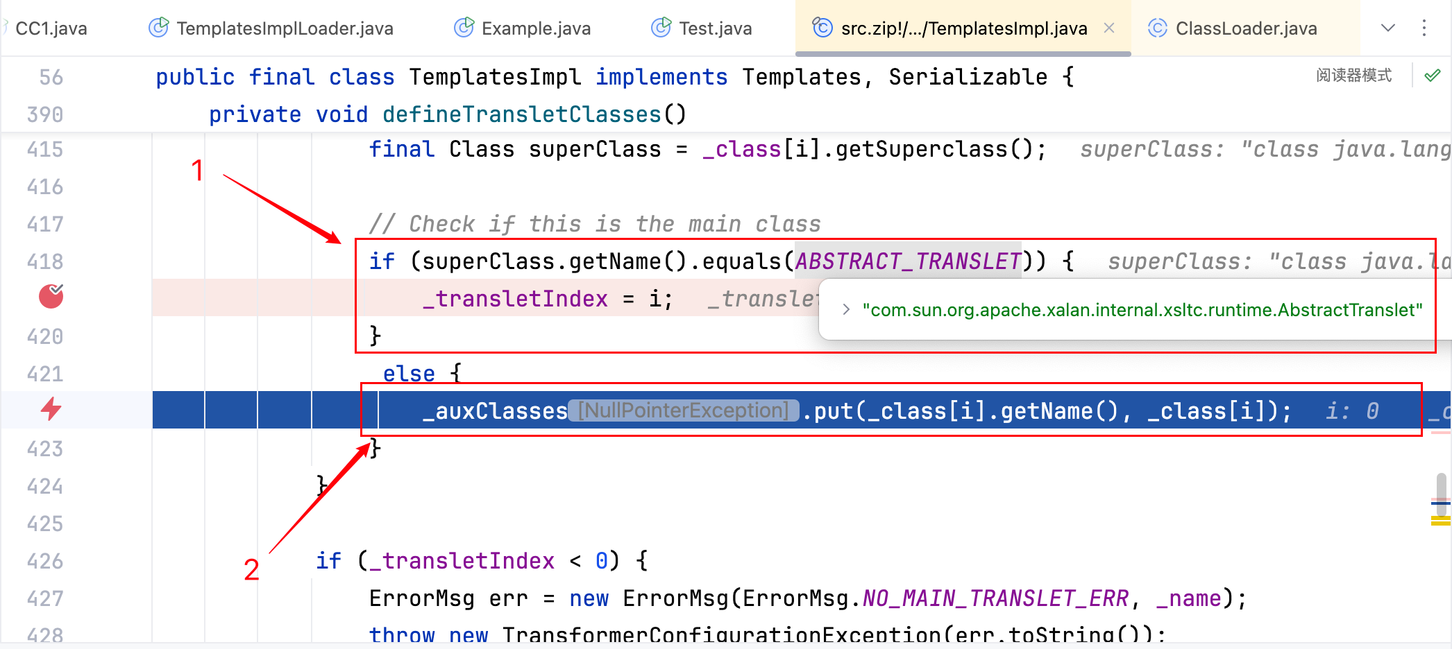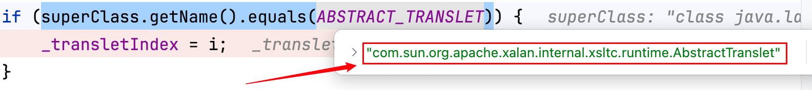 要想走到 1 处则必须满足superClass.getName().equals(ABSTRACT_TRANSLET)