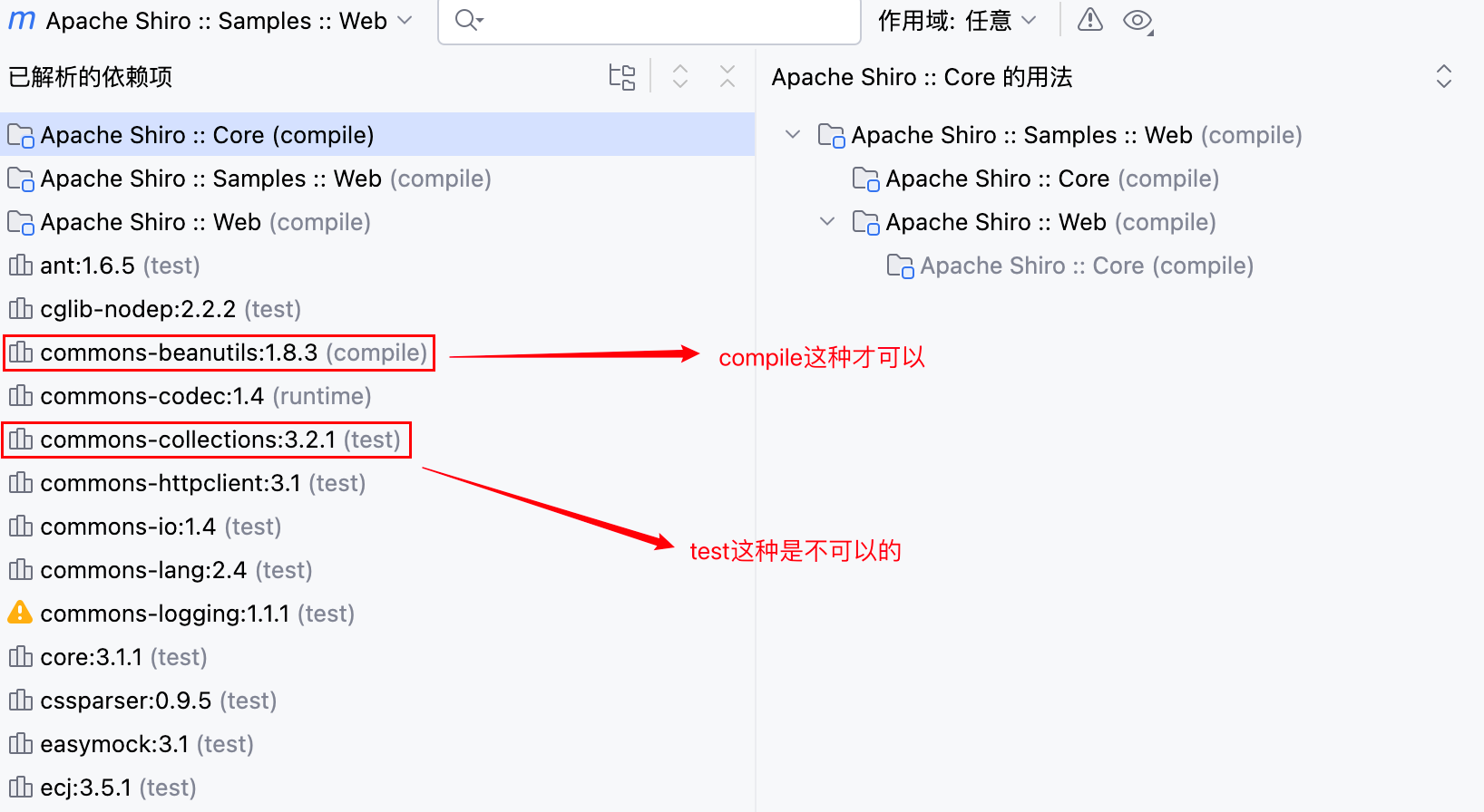 Tips:原生的 Shiro 框架中带着 commons-collections 依赖(是 commons-beanutils 依赖带着它)–>