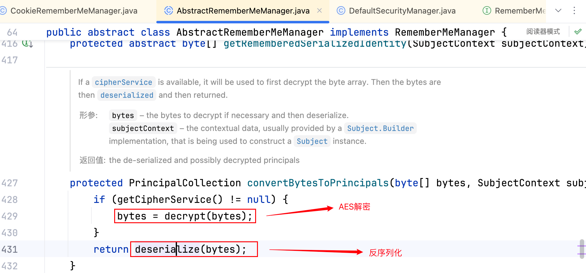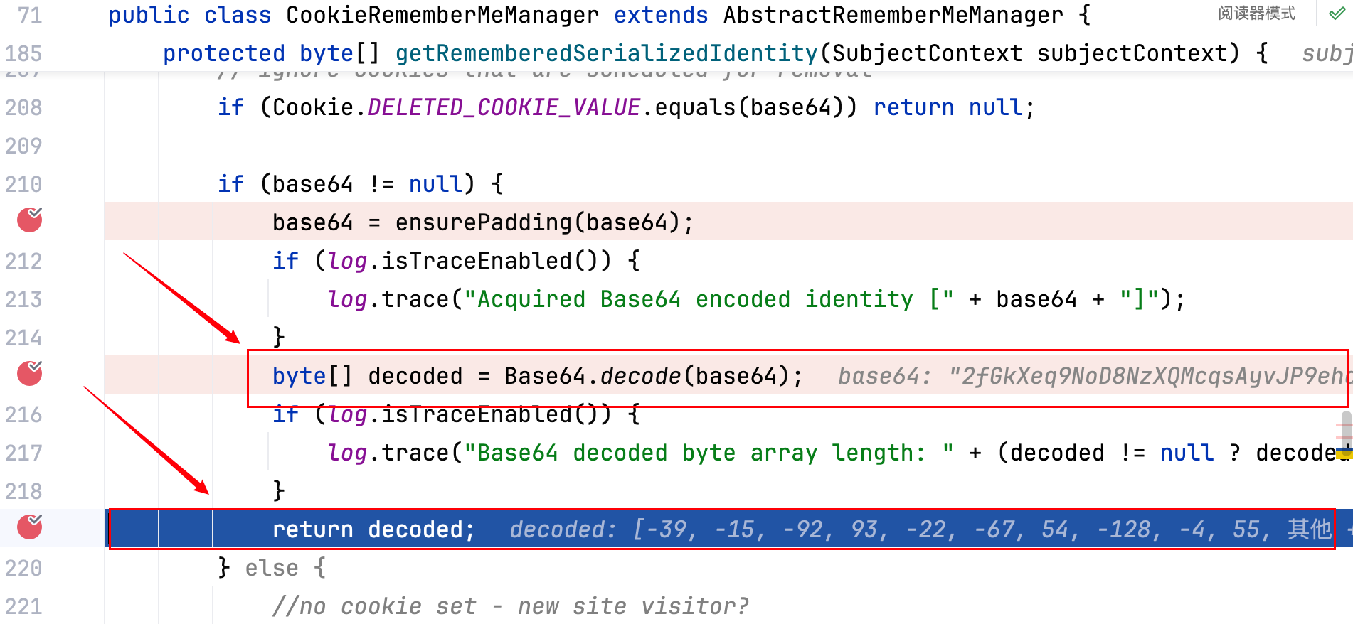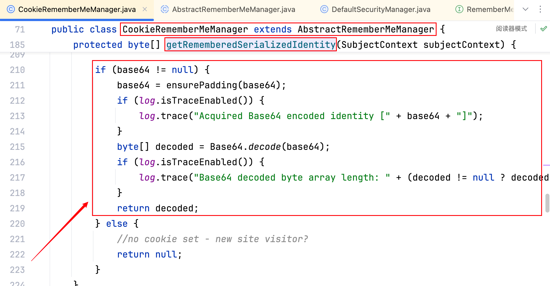 1.全局搜索 🔍RememberMe,定位到 CookieRememberMeManager 类的 getRememberedSerializedIdentity 方法