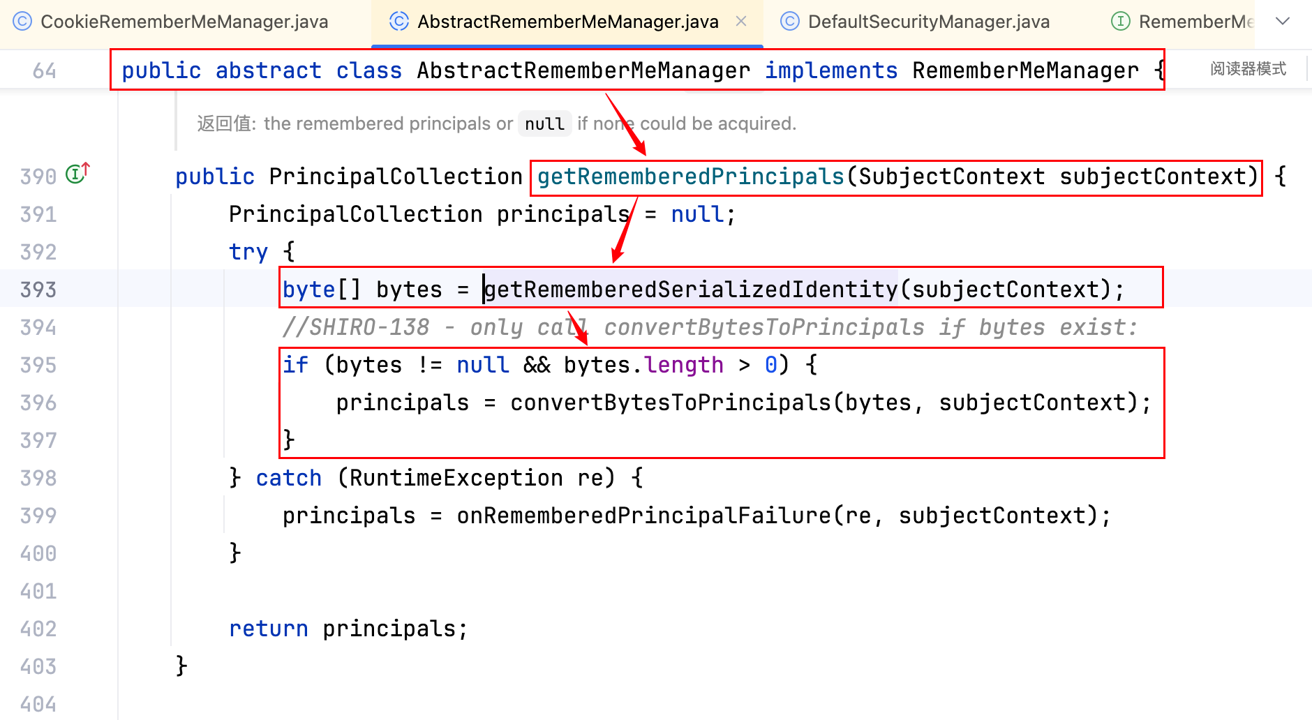 是一个 Base64 解密的函数,查看 getRememberedSerializedIdentity 方法的调用,定位到 AbstractRememberMeManager 类的 getRememberedPrincipals 方法