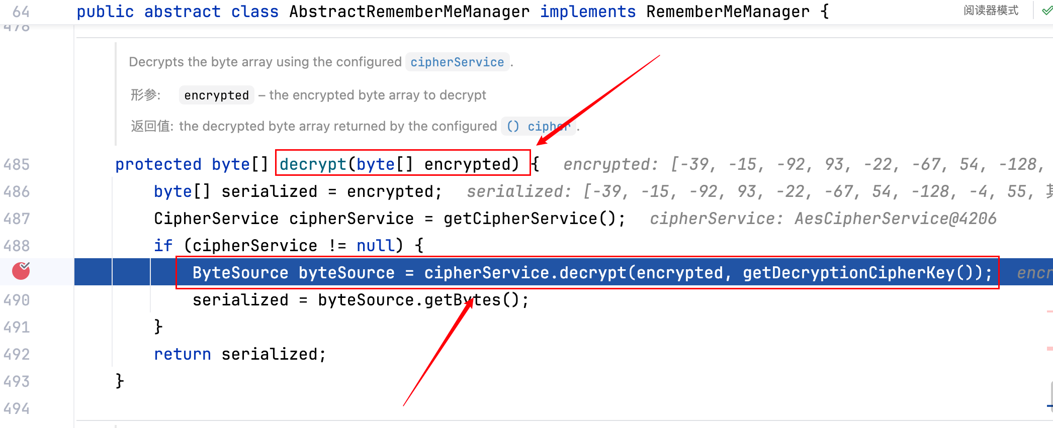 5.服务端会进行身份验证,对RememberMe字段的值进行解密,解密流程: