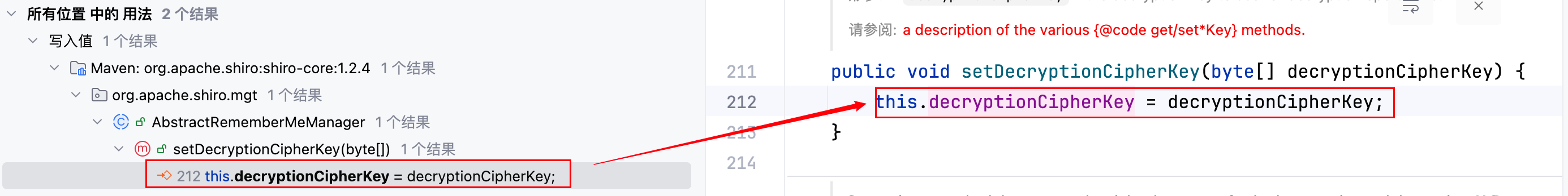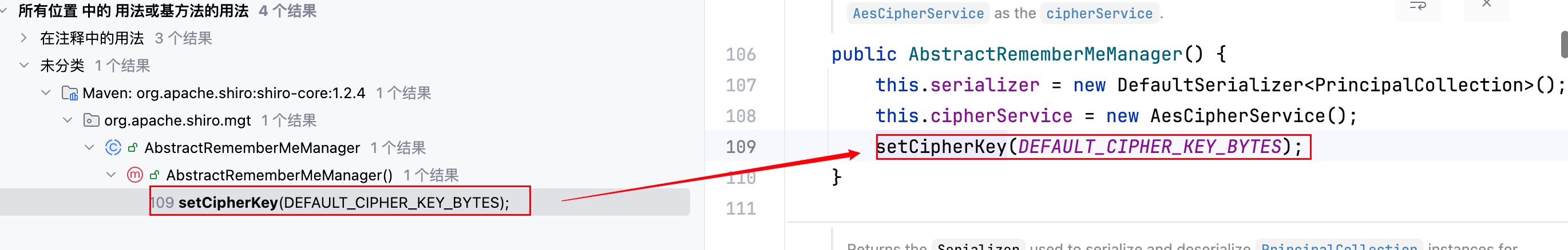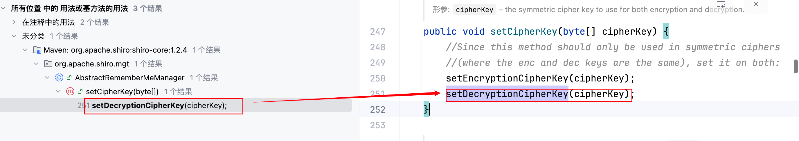 问题就出现在于 AES 加密和解密的密钥 key,在 Shiro 1.2.4 版本之前内置了一个默认且固定的加密 Key,导致攻击者可以伪造恶意字节流当做 rememberMe 字段,进而在反序列化的时候触发 readObject(EntryClass)–>Gadgets–>Sink。