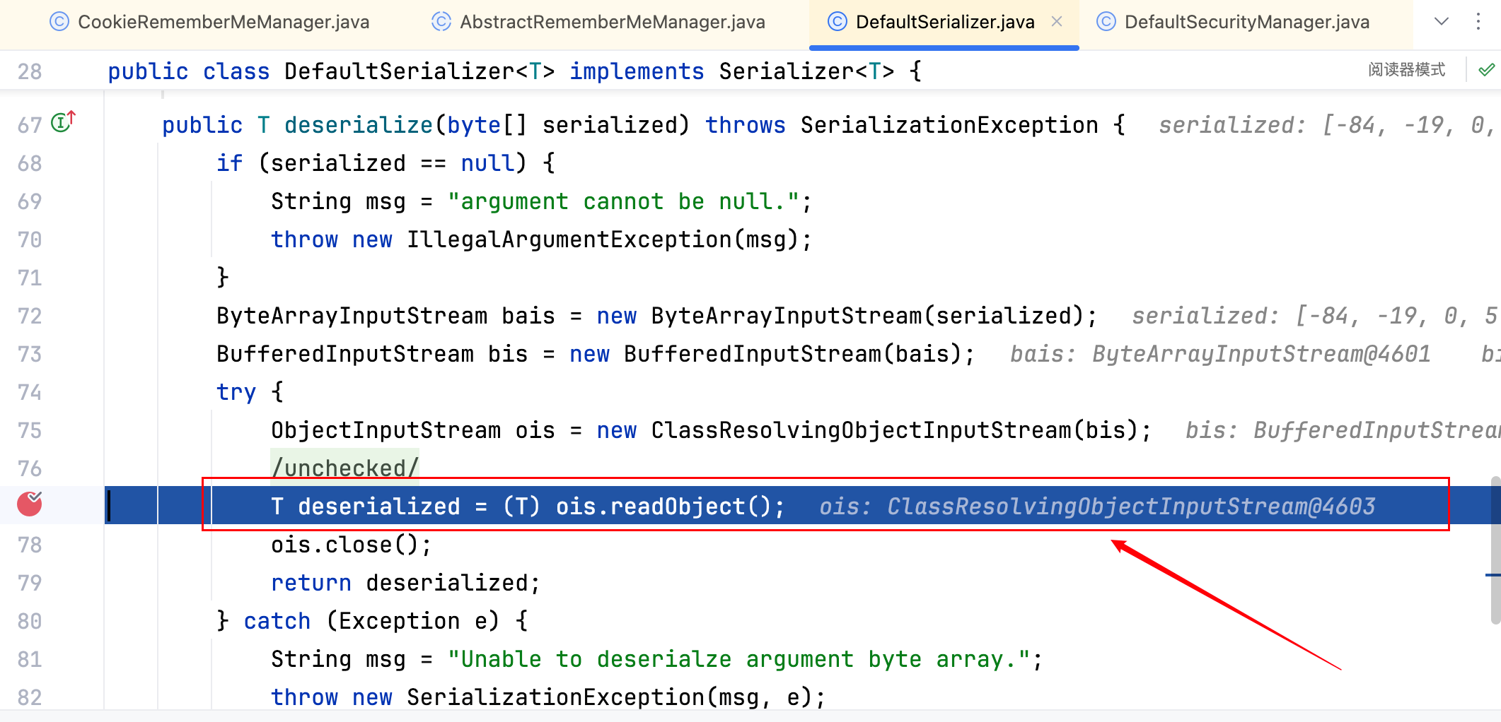 一个反序列化异常,说明 Shiro 在尝试从存储中读取 rememberMe 数据时遇到了问题。特别是 ClassNotFoundException 和 UnknownClassException 提示 Shiro 试图加载一个类 (org.apache.commons.collections.Transformer),但是失败了。调试一下–>