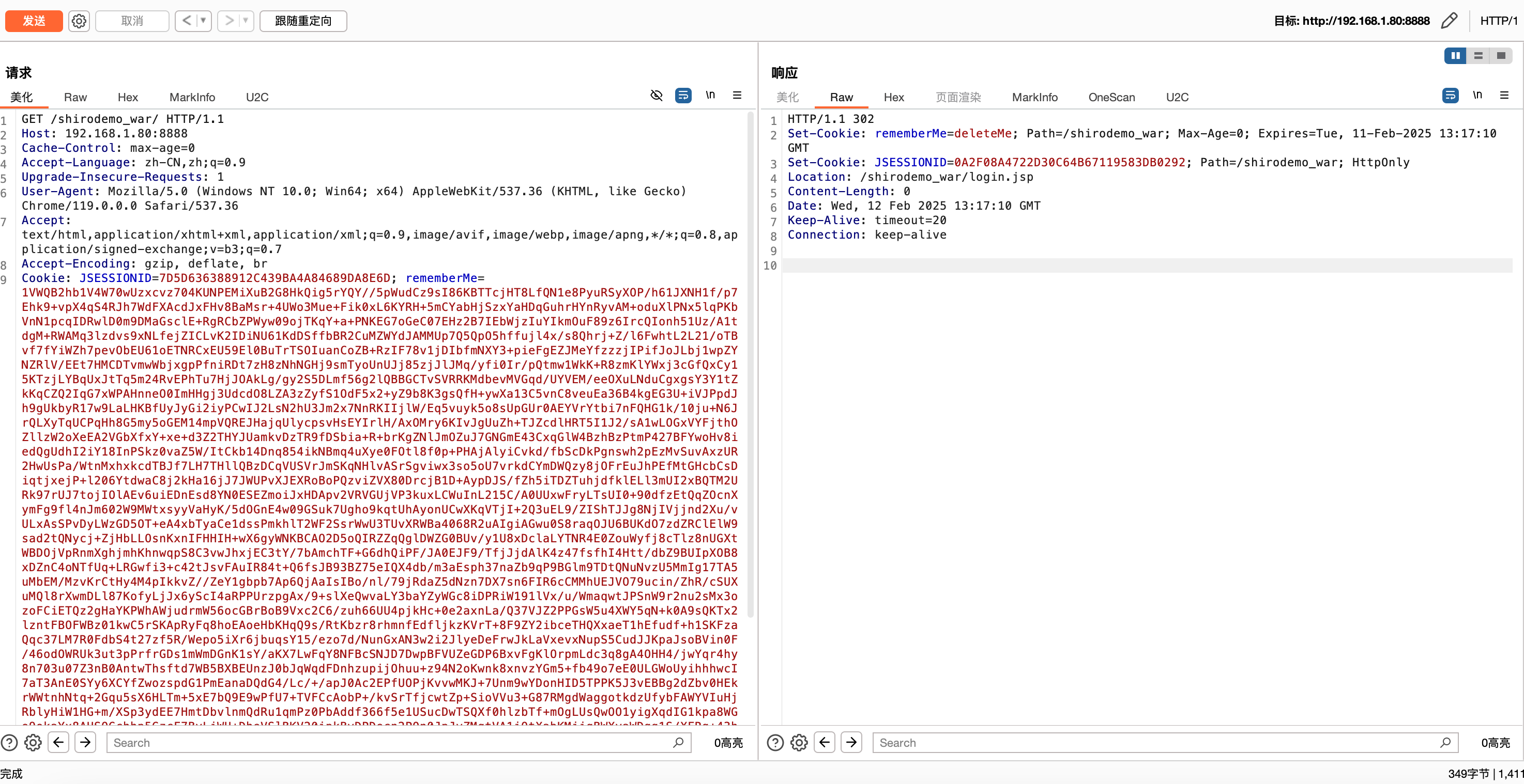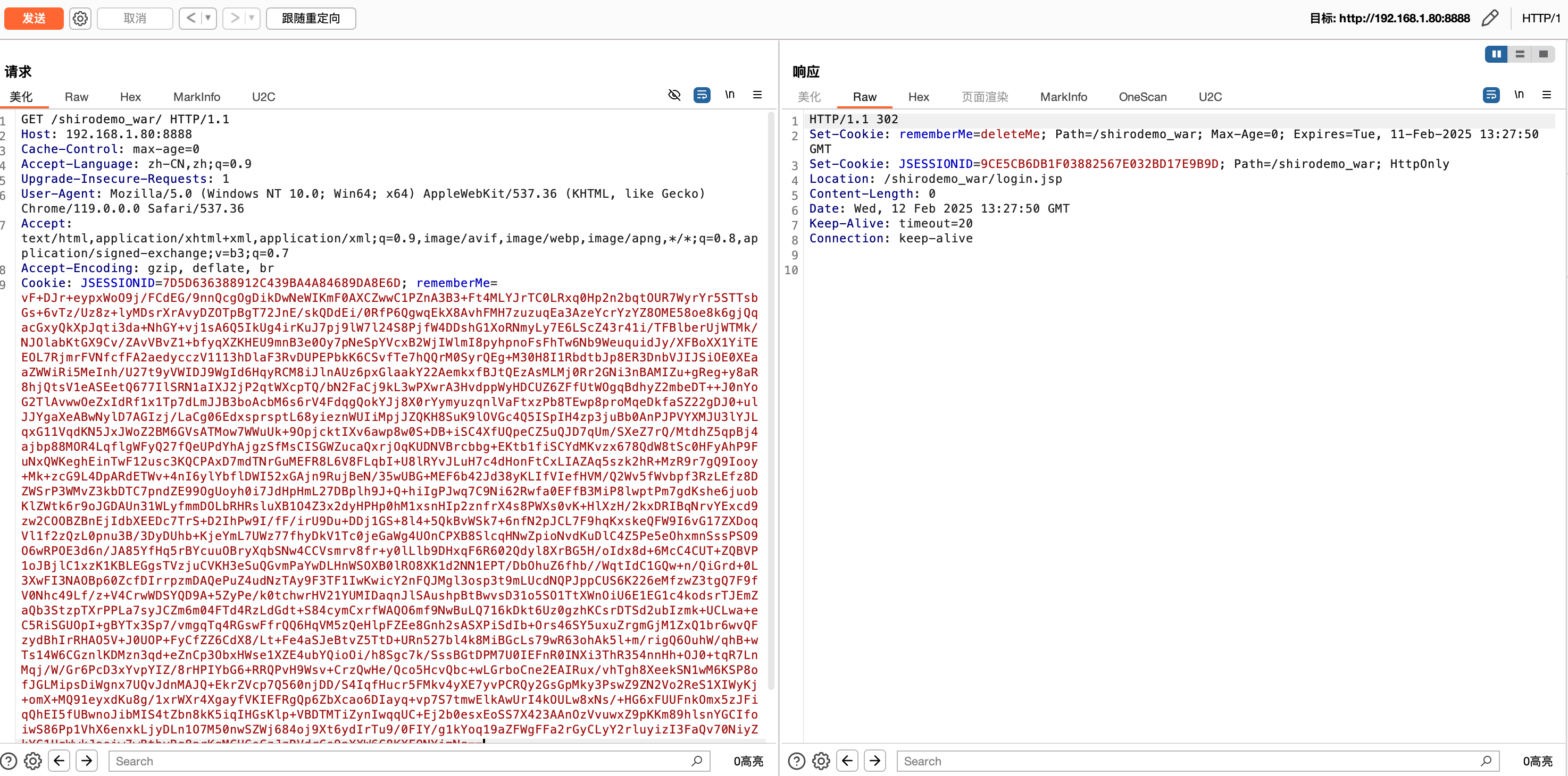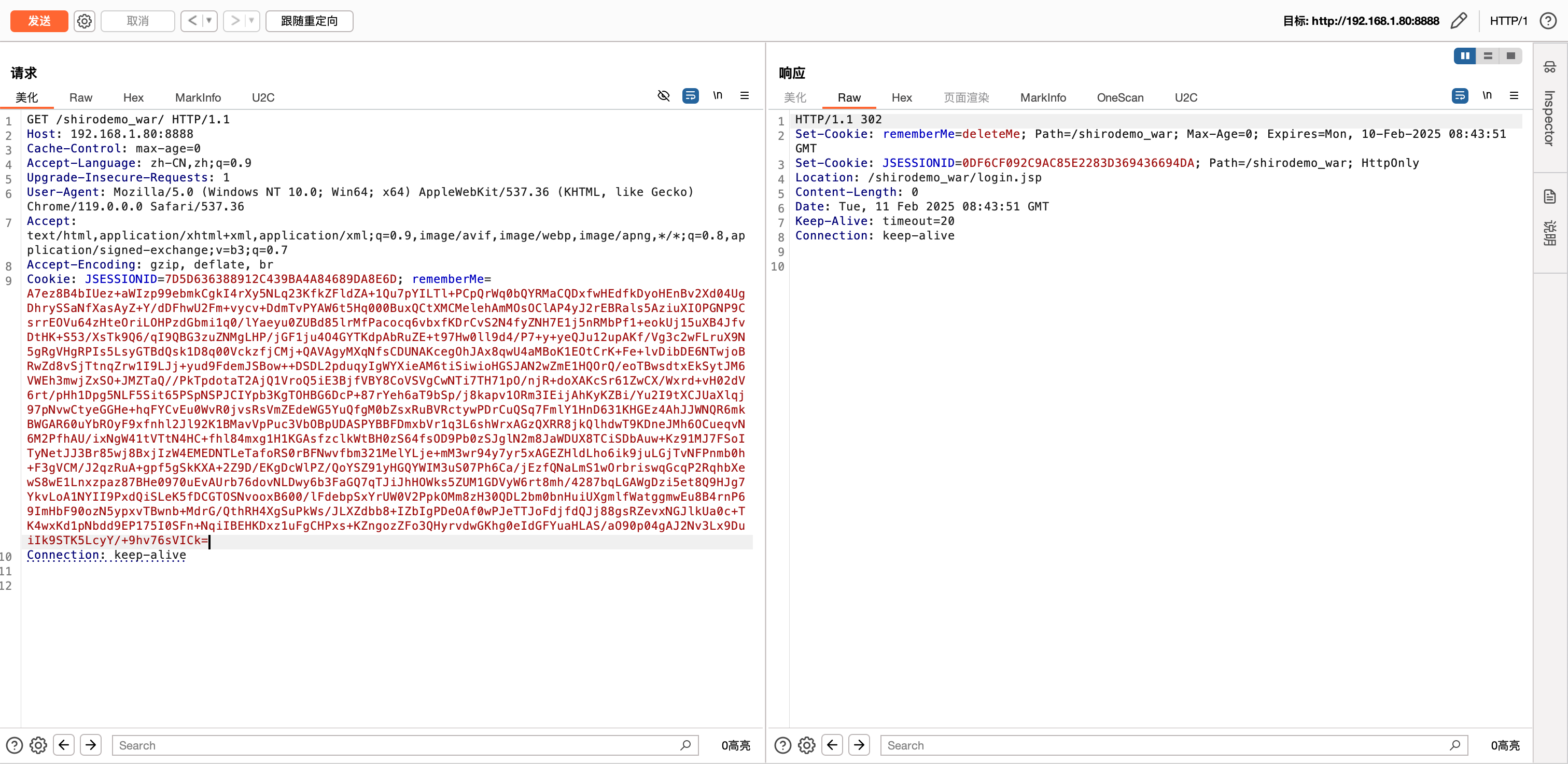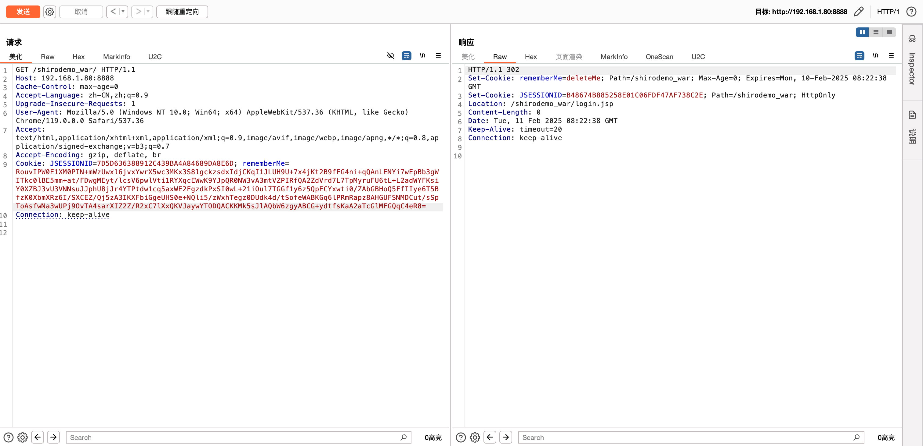 将生成的 Payload 打入 Cookie 的 rememberMe 字段,即可触发漏洞–>