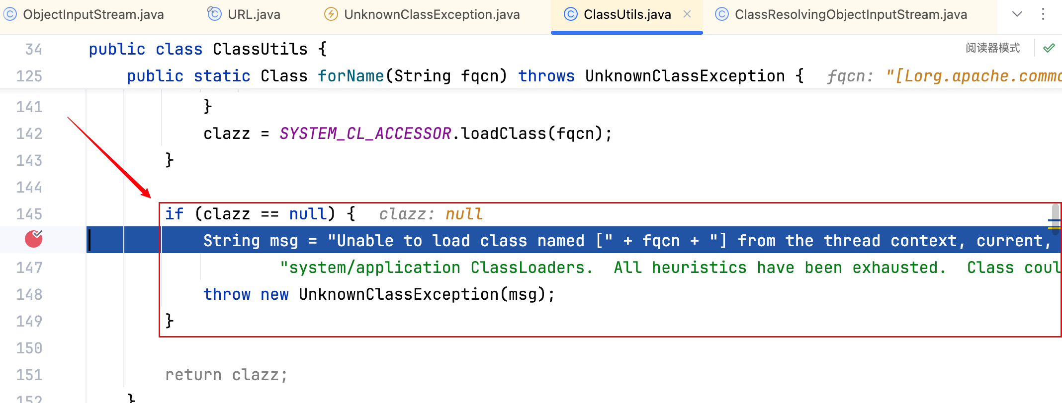 至此报错原因就是因为 Shiro 框架中 ClassResolvingObjectInputStream 类重写了 resolveClass 方法,方法中的ClassUtils.forName(osc.getName());