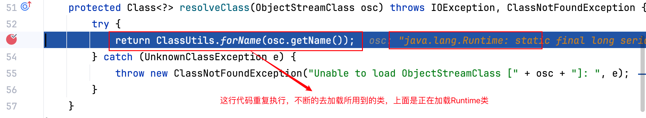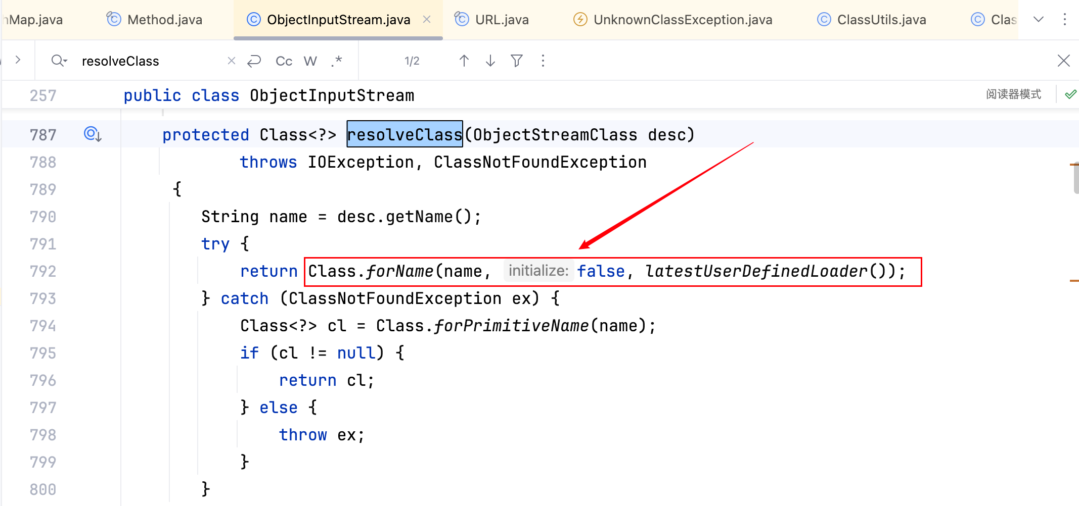resolveClass 很熟悉了,resolveClass 是反序列化中用来查找类的方法,简单来说,读取序列化流的时候,读到一个字符串形 式的类名,需要通过这个方法来找到对应的 java.lang.Class 对象。