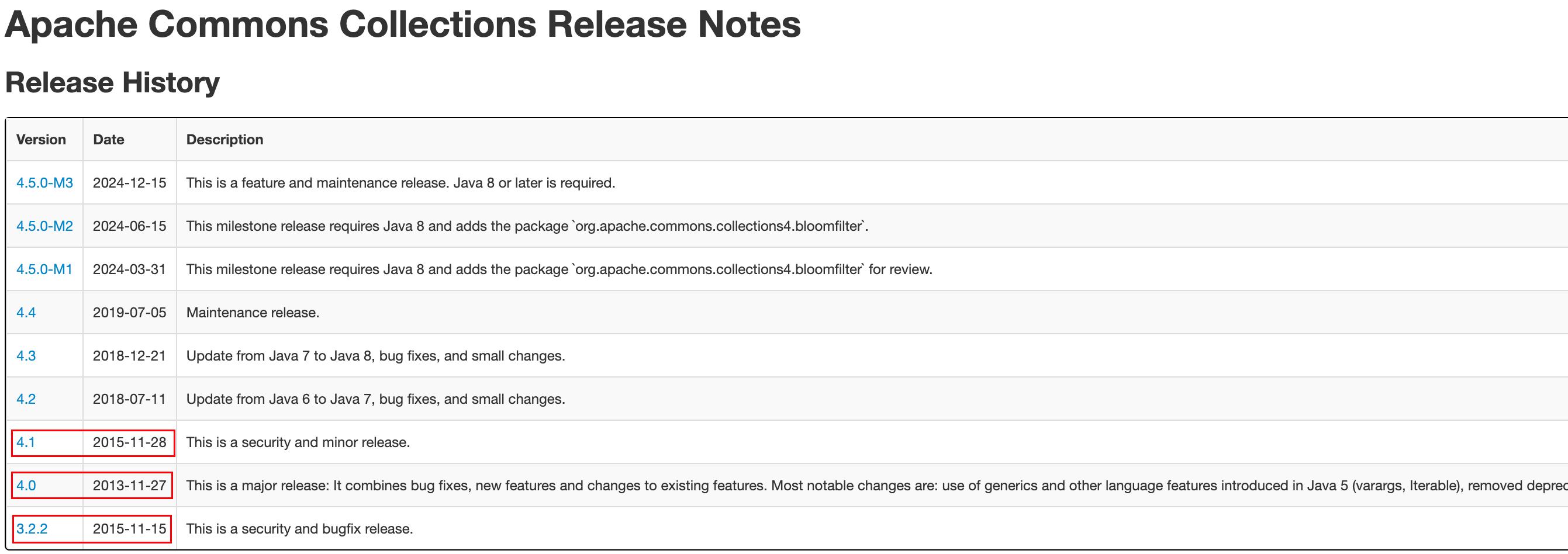 在历史背景中也提及过了,Apache Commons Collections 官⽅在 2015 年底得知序列化相关的问题后,就在两个分⽀ 上同时发布了新的版本,4.1 和 3.2.2。两个版本描述分别是:This is a security and bugfix release && This is a security and minor release。