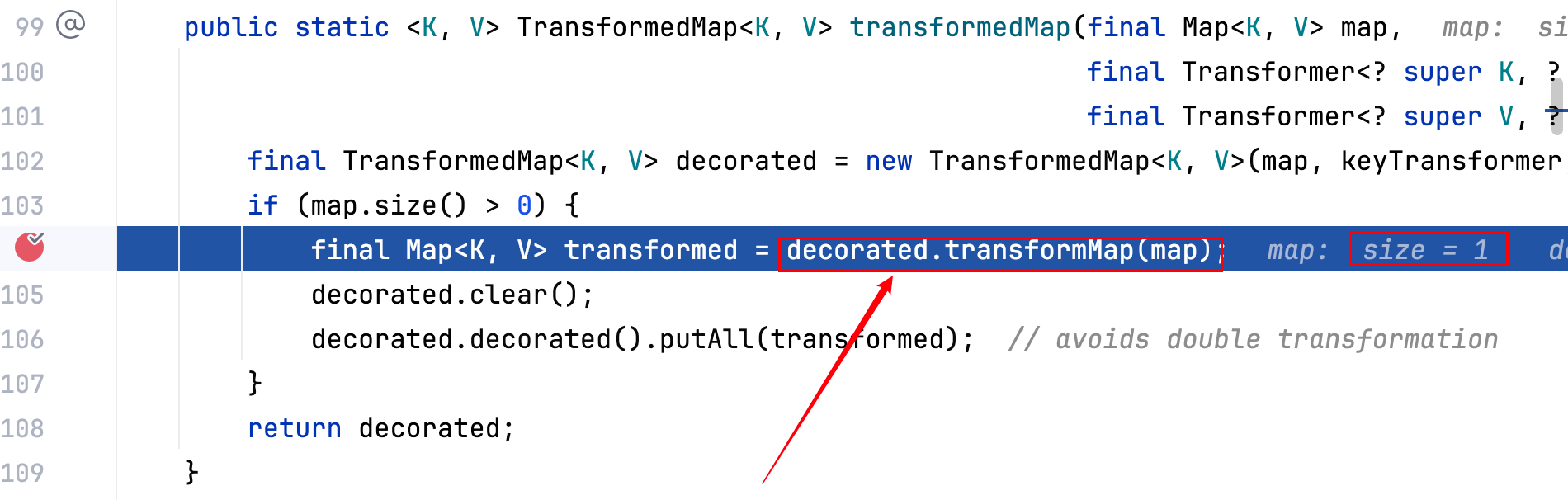 transformedMap 这个方法的逻辑是,判断 map 的 size 是否大于 0,大于 0 则进入decorated.transformMap(map)