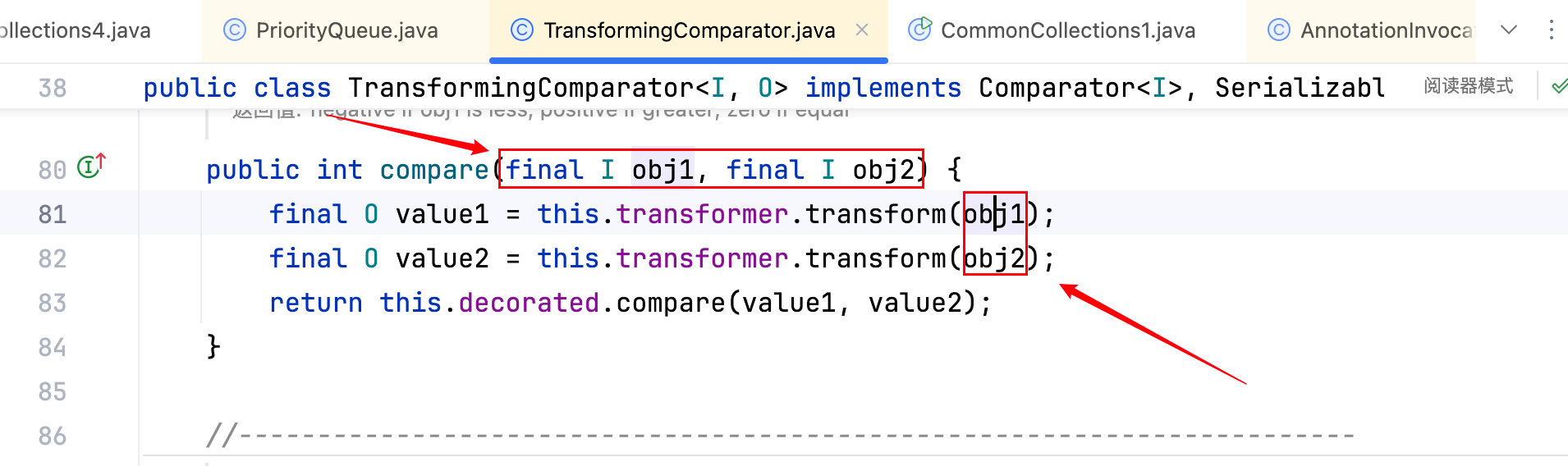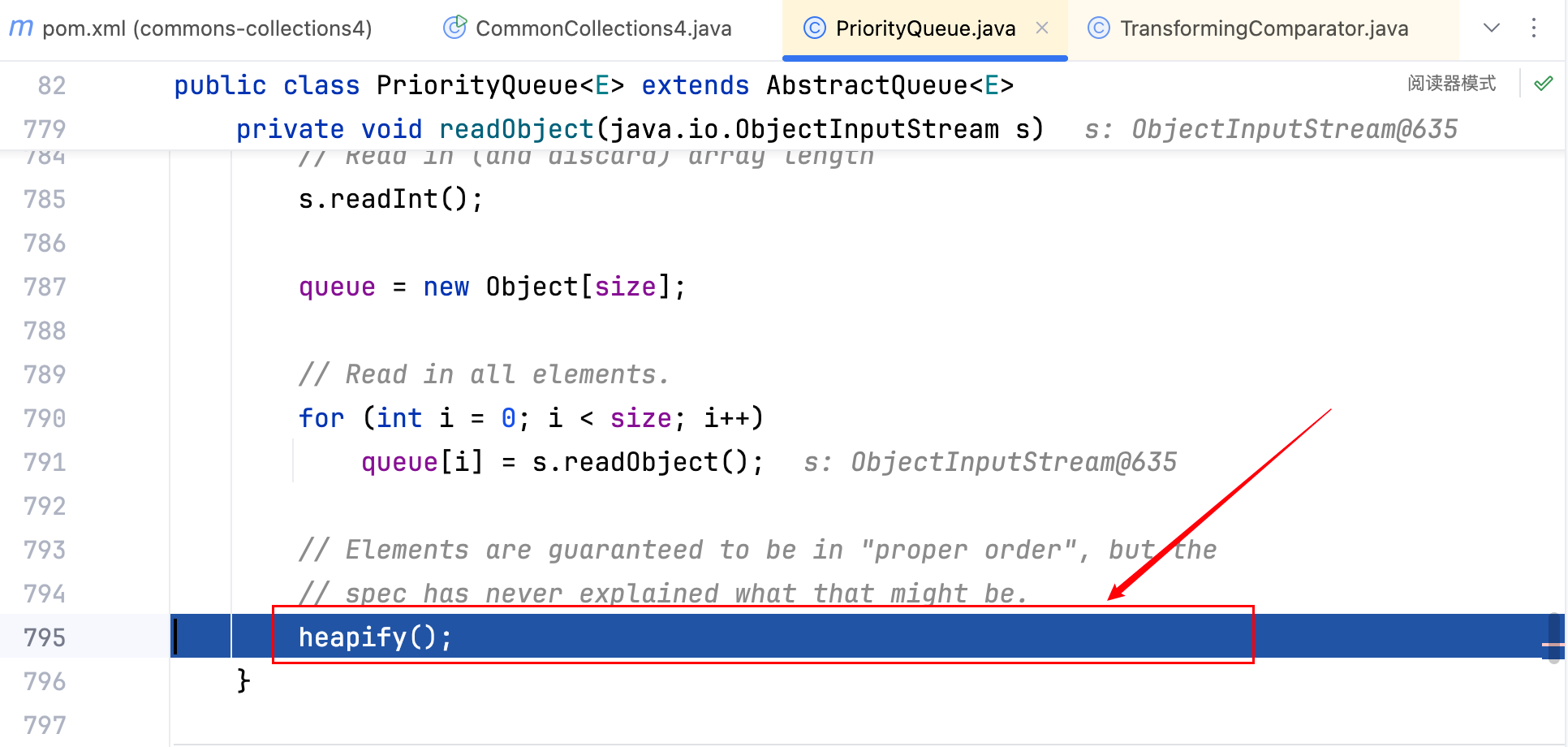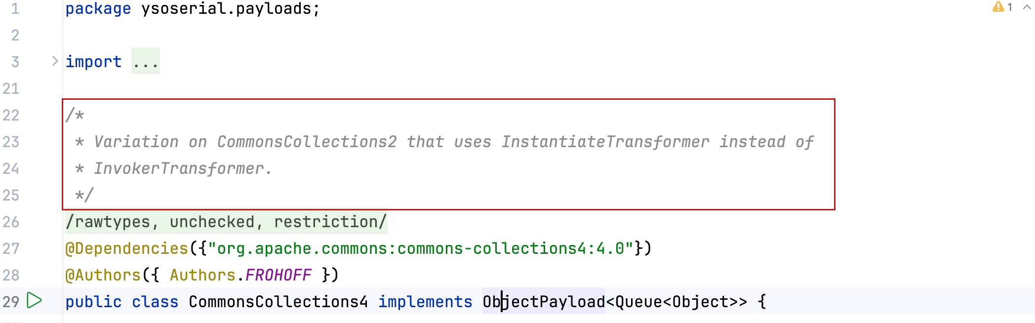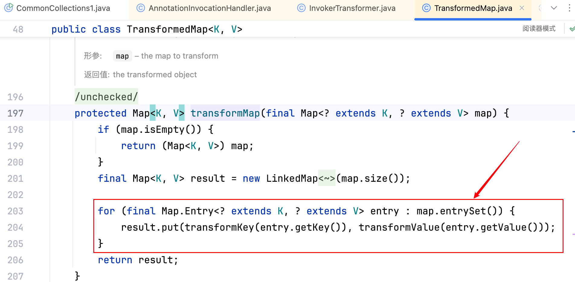 这个检查在常⻅的危险 Transformer 类( InstantiateTransformer 、 InvokerTransformer 、 PrototypeFactory 、 CloneTransformer 等)的 readObject ⾥进⾏调⽤,所以,当反序列化包含这些对象时就会抛出异常。