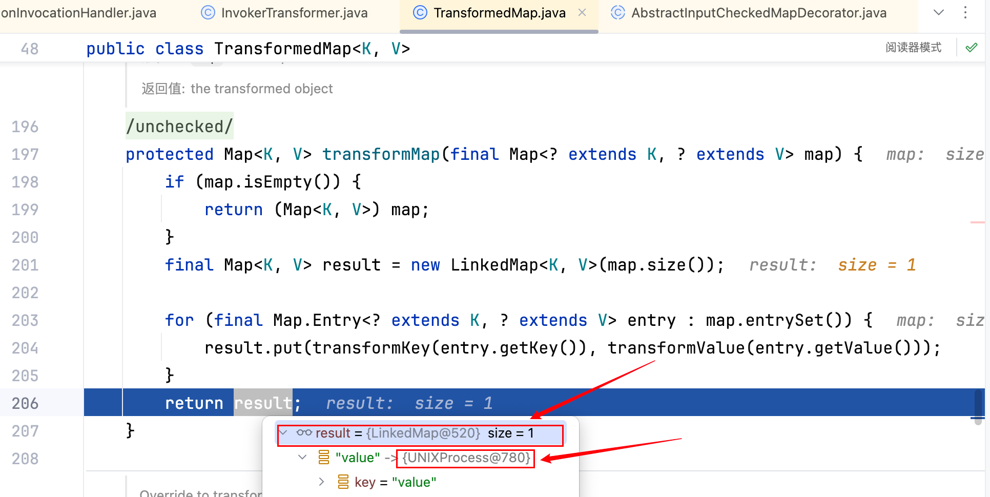这样往后继续执行 CC1 的剩余部分肯定是不行了,且会报错(LinkedMap 类中的 UNIXProcess 没有继承 Serializable 接口)。transformedMap(xxx)