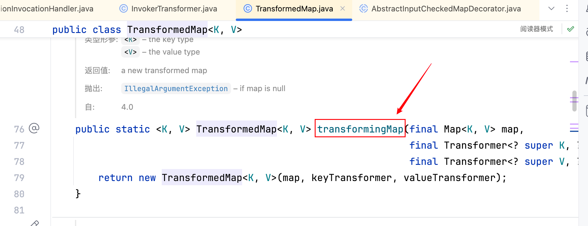但同时可以发现 TransformedMap 类还有一个 static 类型的构造方法transformingMap(xxx)