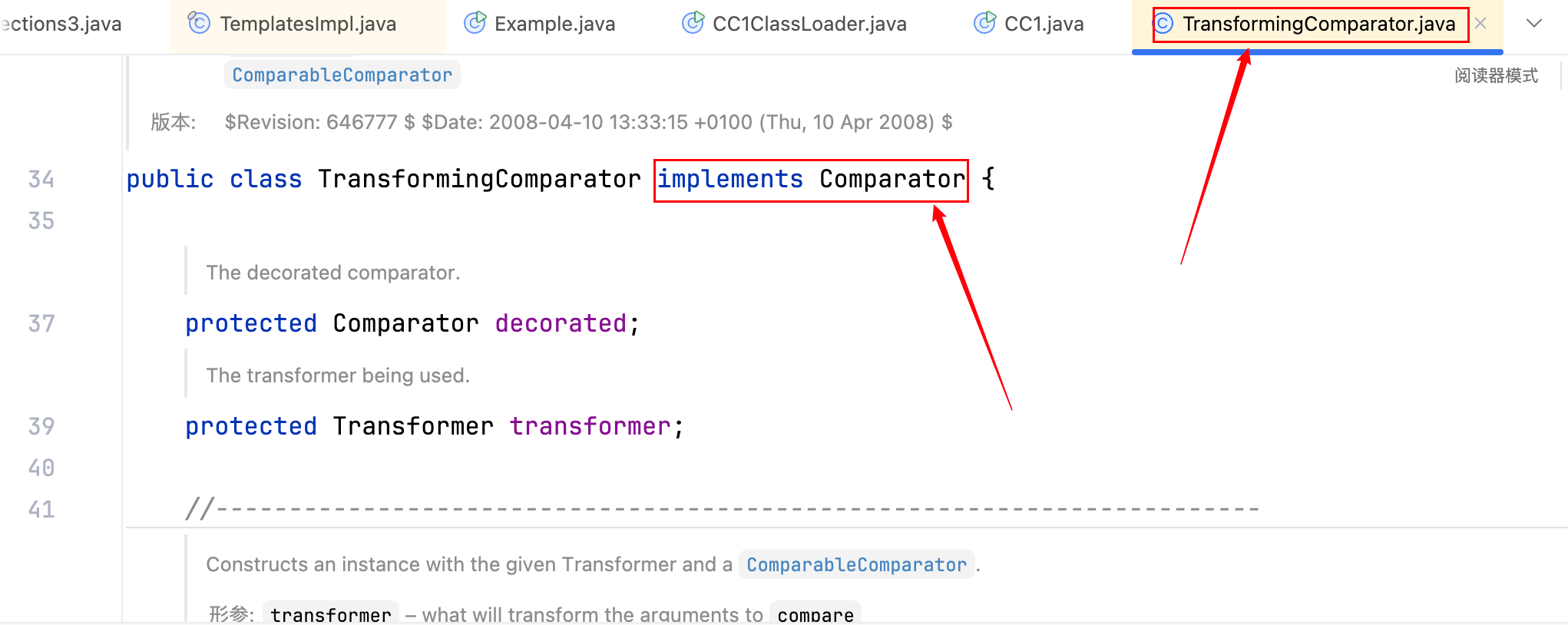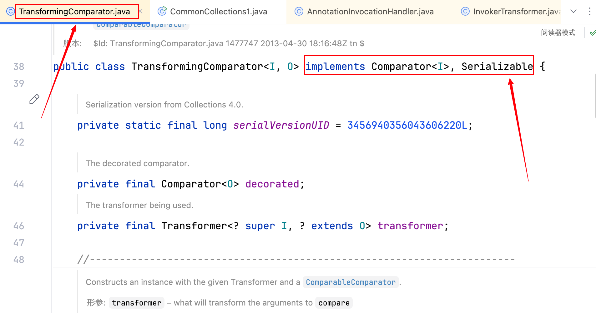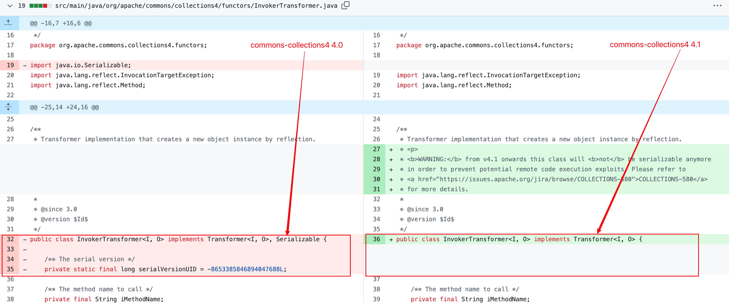 2.再看 4.1 版本的修复方案,它将这⼏个危险 Transformer 类不再实现 Serializable 接⼝–>