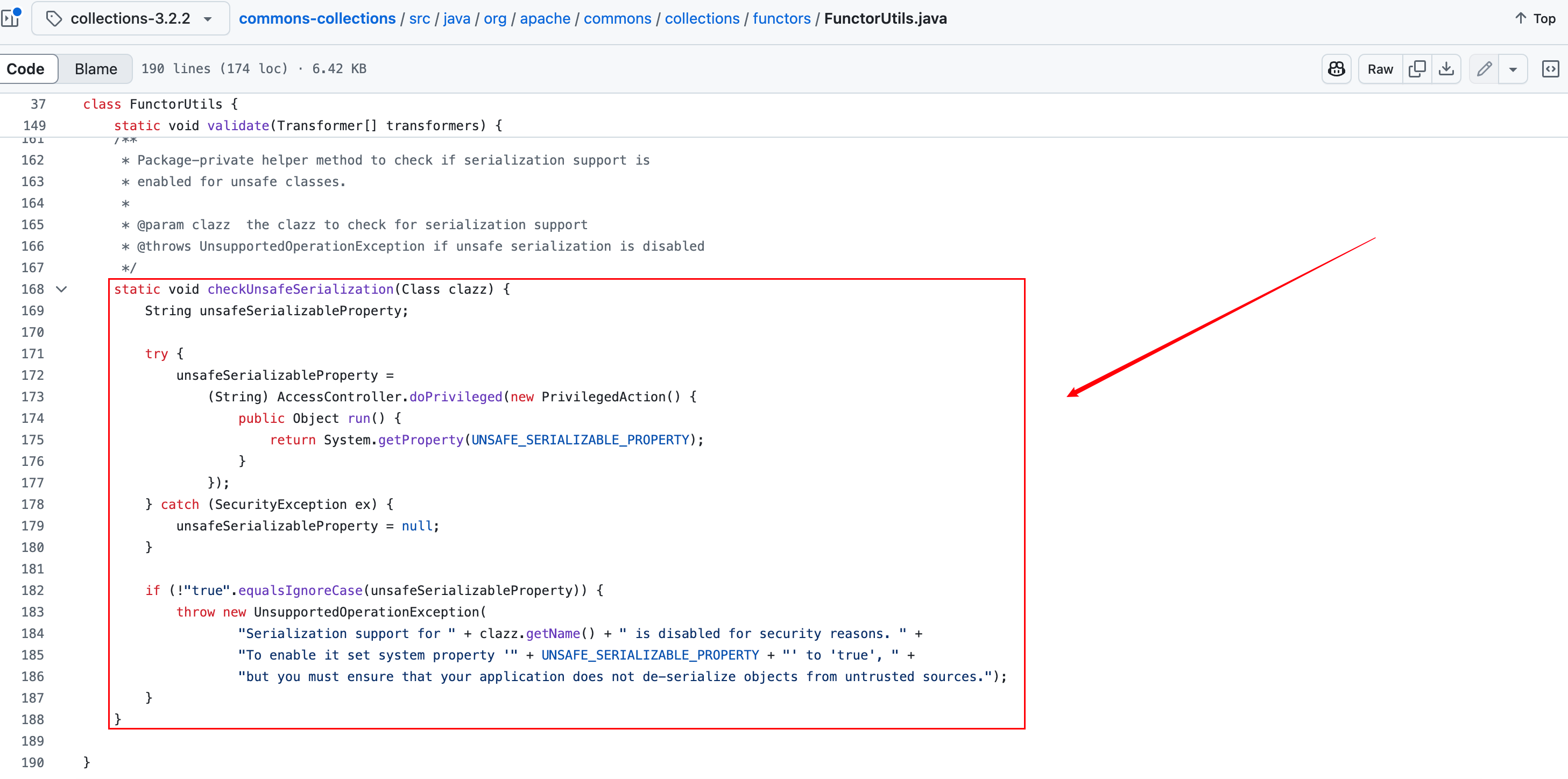 1.先看 3.2.2 版本的修复方案,它增加了⼀个⽅法FunctorUtils.checkUnsafeSerialization()